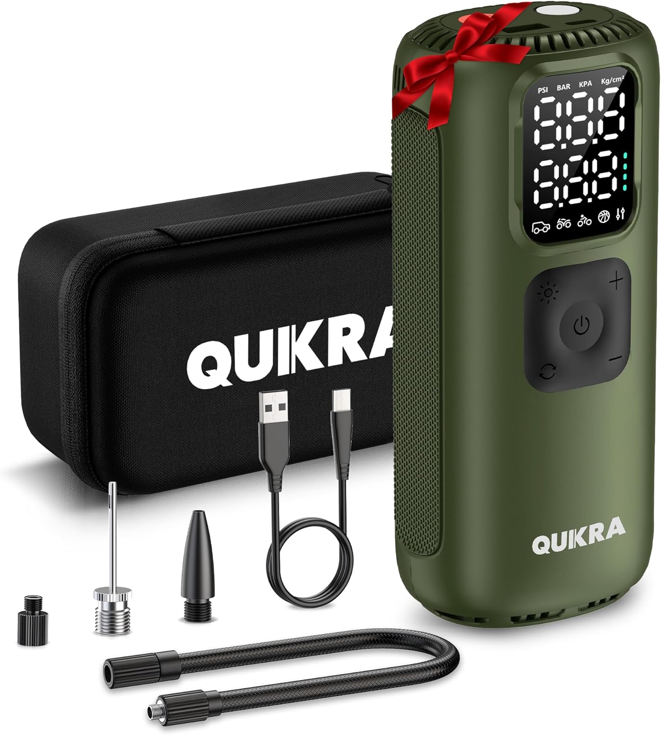 - [Package Include]: Smart portable tire inflator T22 (green)*1, storage bag*1, schrader valve air hose*1, presta valve*1, ball needle*1, type-C charging cable*1, swimming ring valve*1, service manual*1. If you have any questions, we are here to help you, QUIKRA devoted to provide premium product and customer-satisfying service