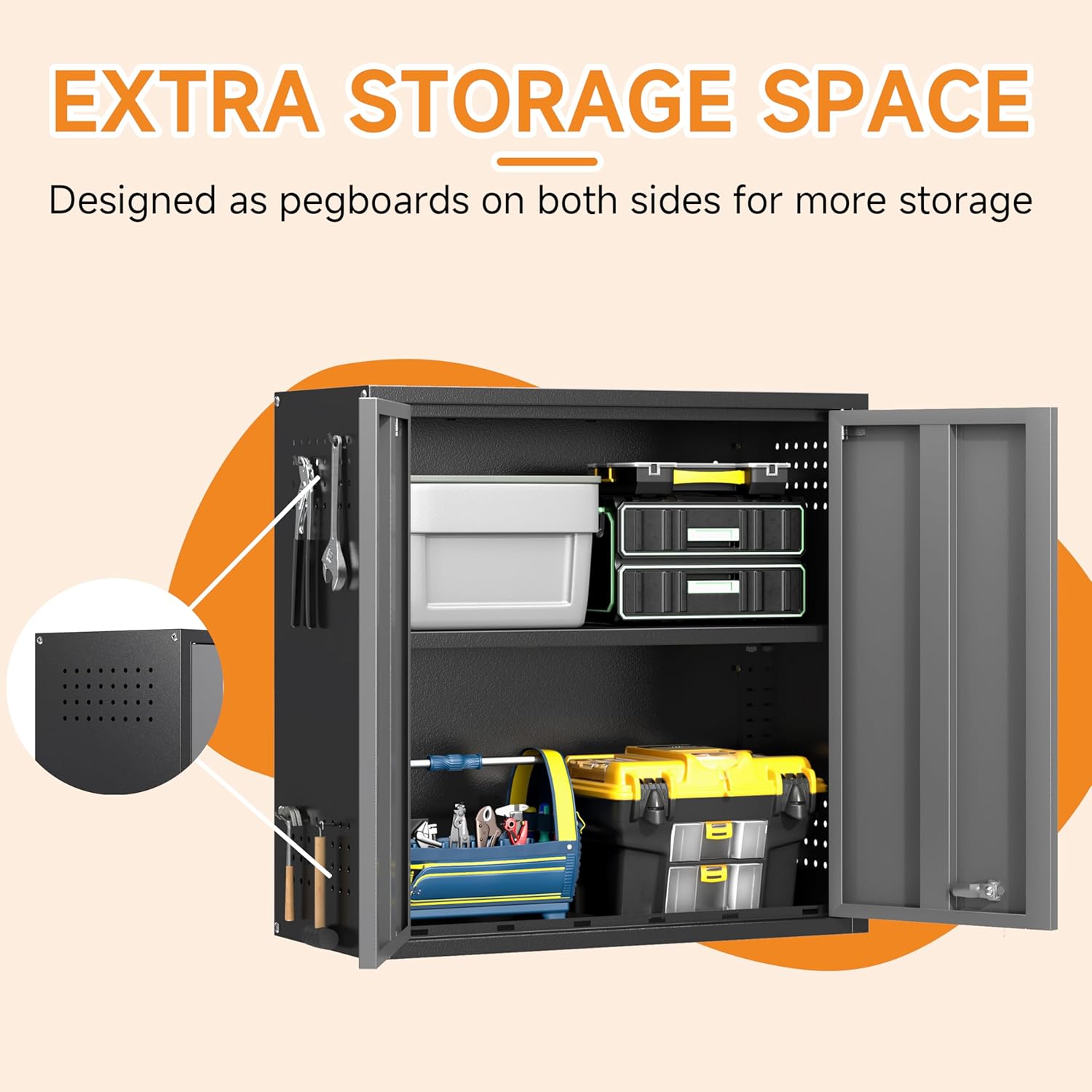 Metal Garage Wall Cabinet with 2 Doors and 1 Adjustable Shelf,Lockable Floating Tool Cabinet with Pegboard,Steel Storage Cabinet for Kitchen,Office,Garage,Laundry,Warehouse(Black&Gray, 26"H)