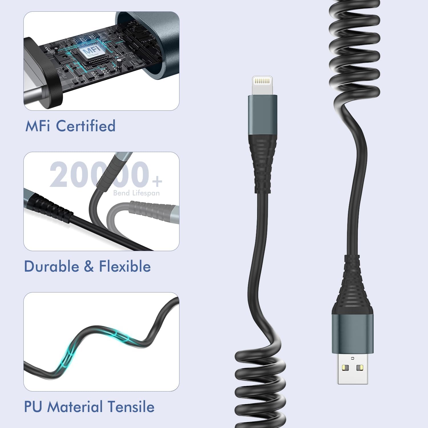 - 【Coiled Lightning Cable】A retractable iPhone car charger designed with high-elasticity TPU material and a spring structure (tested for 20,000+ stretch cycles).The short iPhone charger cord features a flexible coil that resists deformation, smoothly extends from 1ft to 3ft, and saves space while preventing tangles, with its Lightning connector remaining securely attached even on bumpy roads.