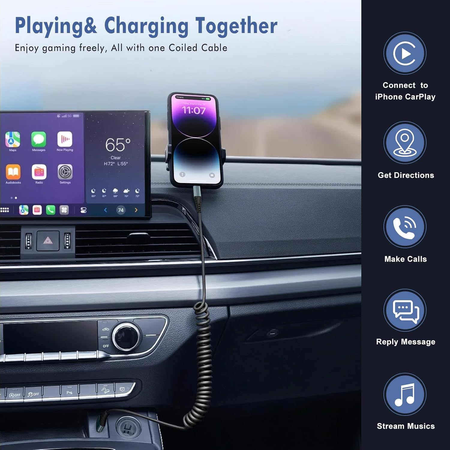 - 【Apple CarPlay Support】: Simply plug in your Lightning cable to enjoy lag-free connectivity that instantly syncs your iPhone with your vehicle's infotainment system, seamlessly syncing music, maps, and calls while charging. It delivers a smarter, smoother experience that transforms every drive into an enjoyable journey.