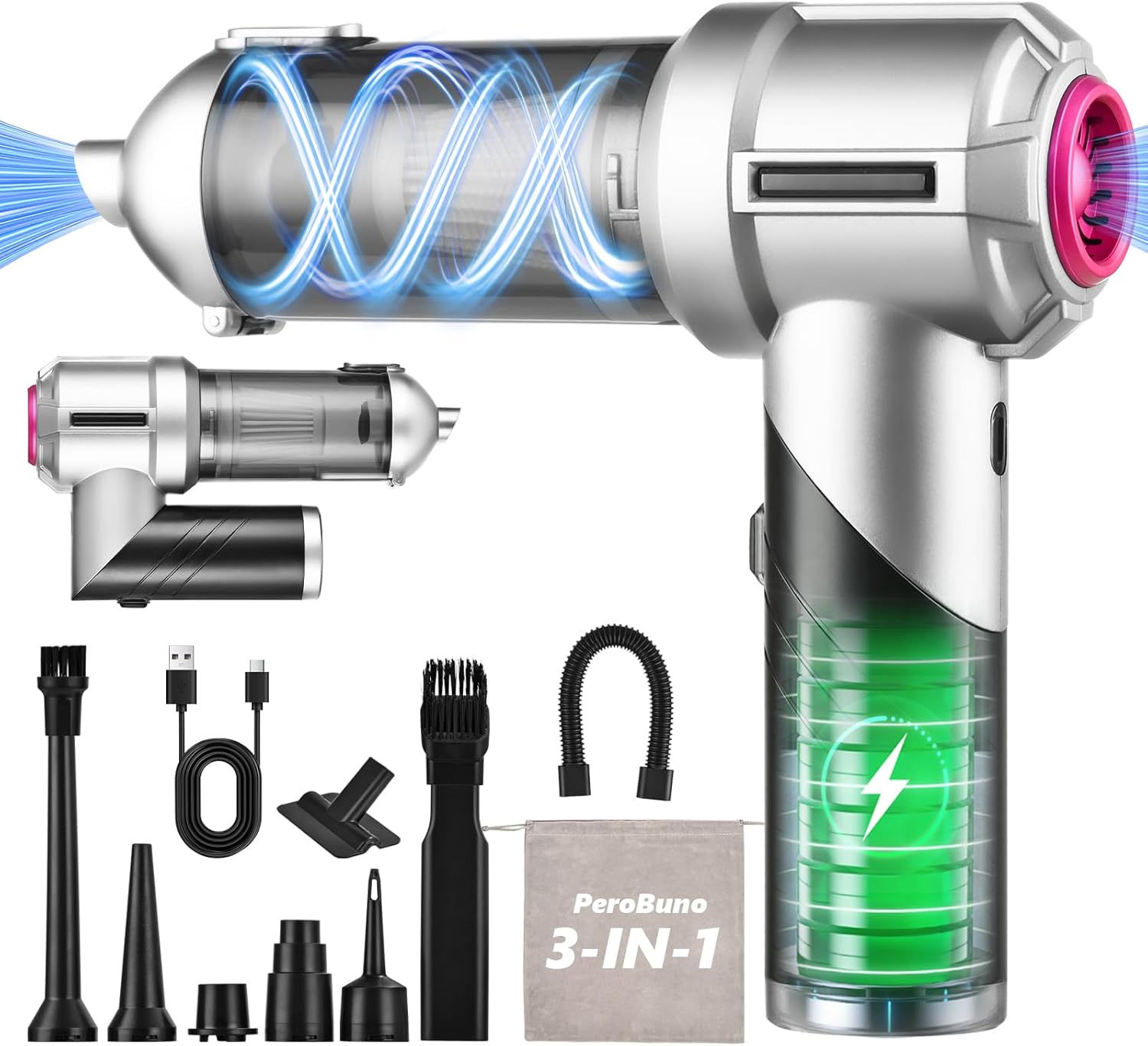PeroBuno Car Vacuum Portable Cordless, 18000PA Suction, 3-in-1 Foldable Handheld Vacuum & Air Duster with Brushless Motor, 40mins Runtime, One-Click Dust Removal for Car Home Cleaning