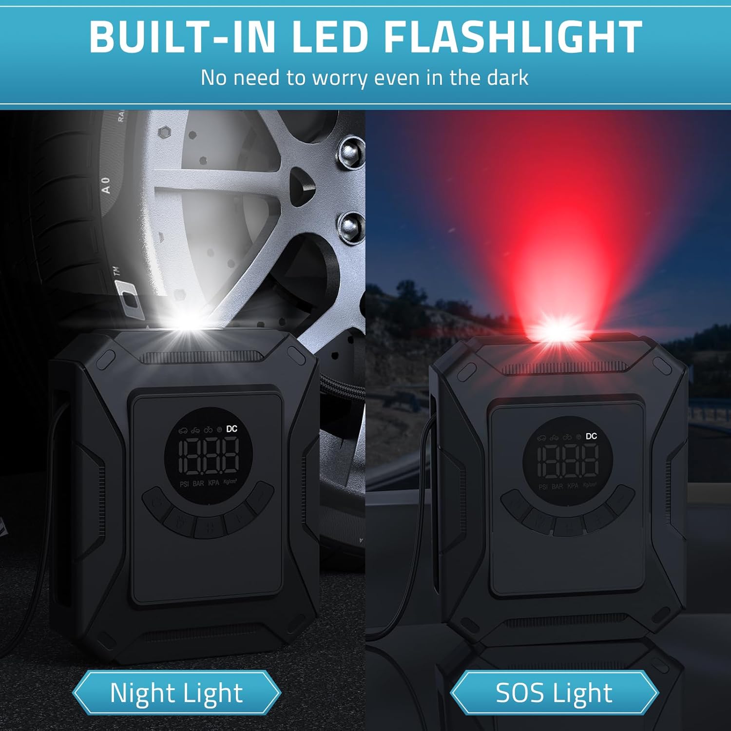 - 【LED LIGHT & REAL-TIME DIGITAL SCREEN】 Bright backlight LCD display makes for convenient use at night, help you check the tyre pressure and preset the tyre presure values. The air compressor gauge can display the pressure in PSI, KPA, BAR & KG/CM². PAULINN air pump is equipped with bright and long-lasting LED lights, it has 2 modes (night light & SOS light), easy to use even in the dark.