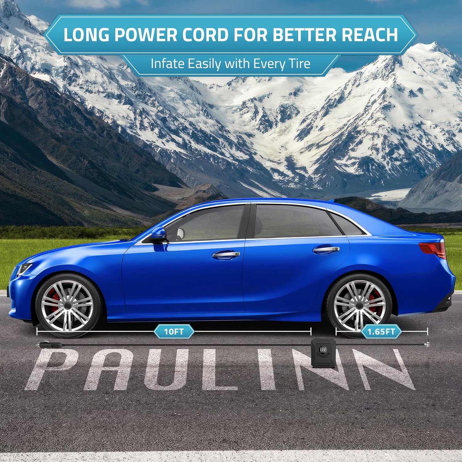 - 【MULTIFUNCTIONAL NOZZLES】 Our air compressor pump has a 10ft power cord and inflatable adaptors( 4 additional nozzles). It offers a wider range of applications to meet various inflation requirements for items like vehicle tires and sports or recreational gear, including compact or midsize sedans, bicycles, motorcycles, air mattresses, inflatable boats, and balls.
