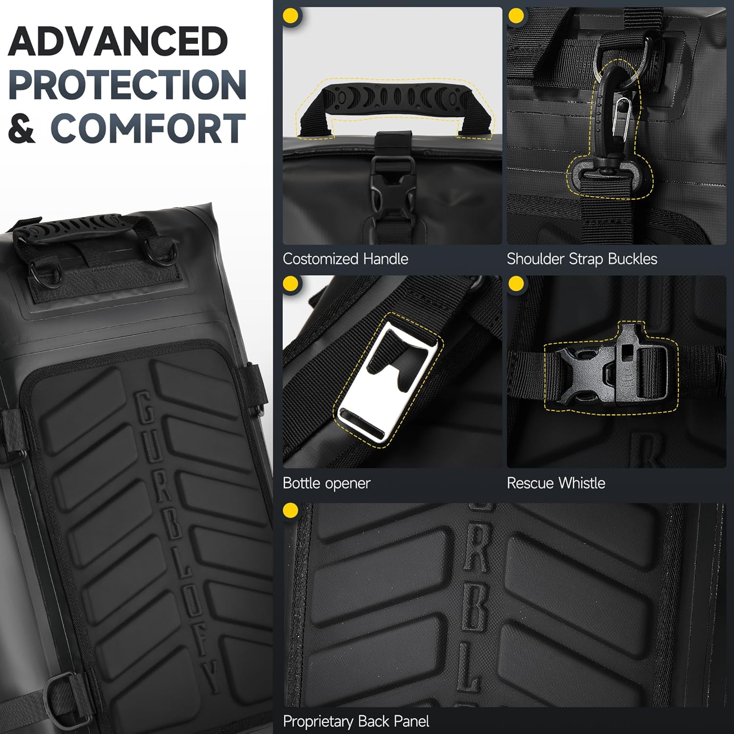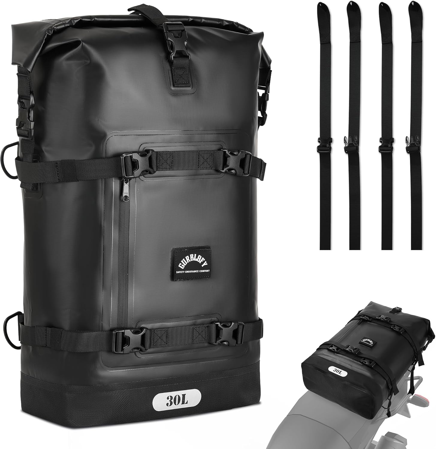 - Rider-Optimized Functional Design. The Gurblofy motorcycle tail bag is engineered with the rider in mind: Its heavy-duty PVC construction withstands all weather conditions, while storm-proof zippers ensure secure closure. The pack features quick-adjust buckles for instant sizing, and our patented textured handle design delivers a firm grip even with gloves. Multi-position straps distribute weight evenly across your back for fatigue-free riding adventures.