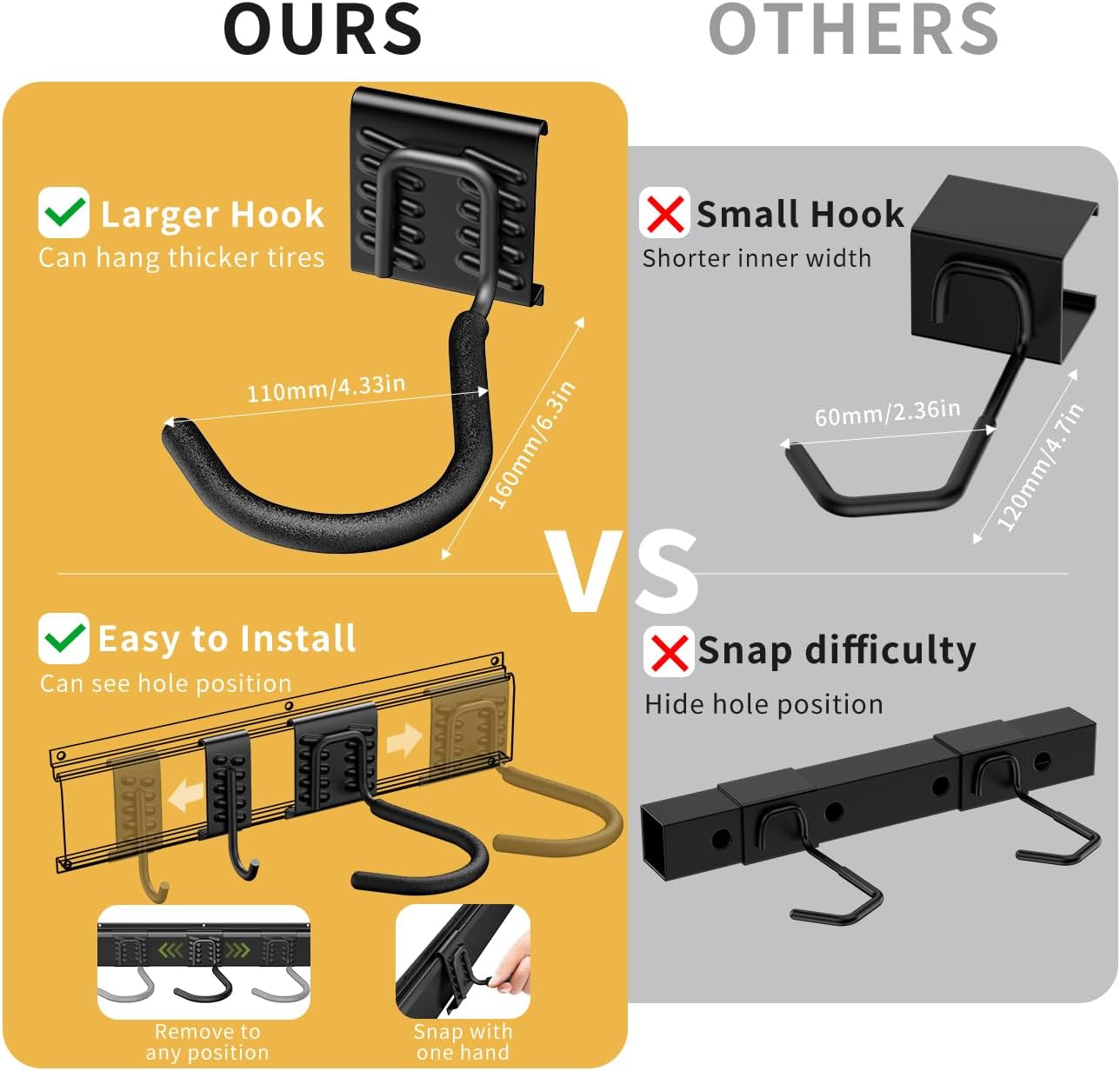 - Upgraded Large J-Hooks: The oversize 3*6.3*4.3in(75*160*110mm)can support up to 75 lbs per hook and accommodate tires up to 5 inches(12.7cm) wide - much larger than standard 2/3 sized hooks. The sturdy steel construction with rubber coating protects your bikes from scratches and sliding. Perfect for organizing your garage or basement, but not recommended for heavy e-bikes.