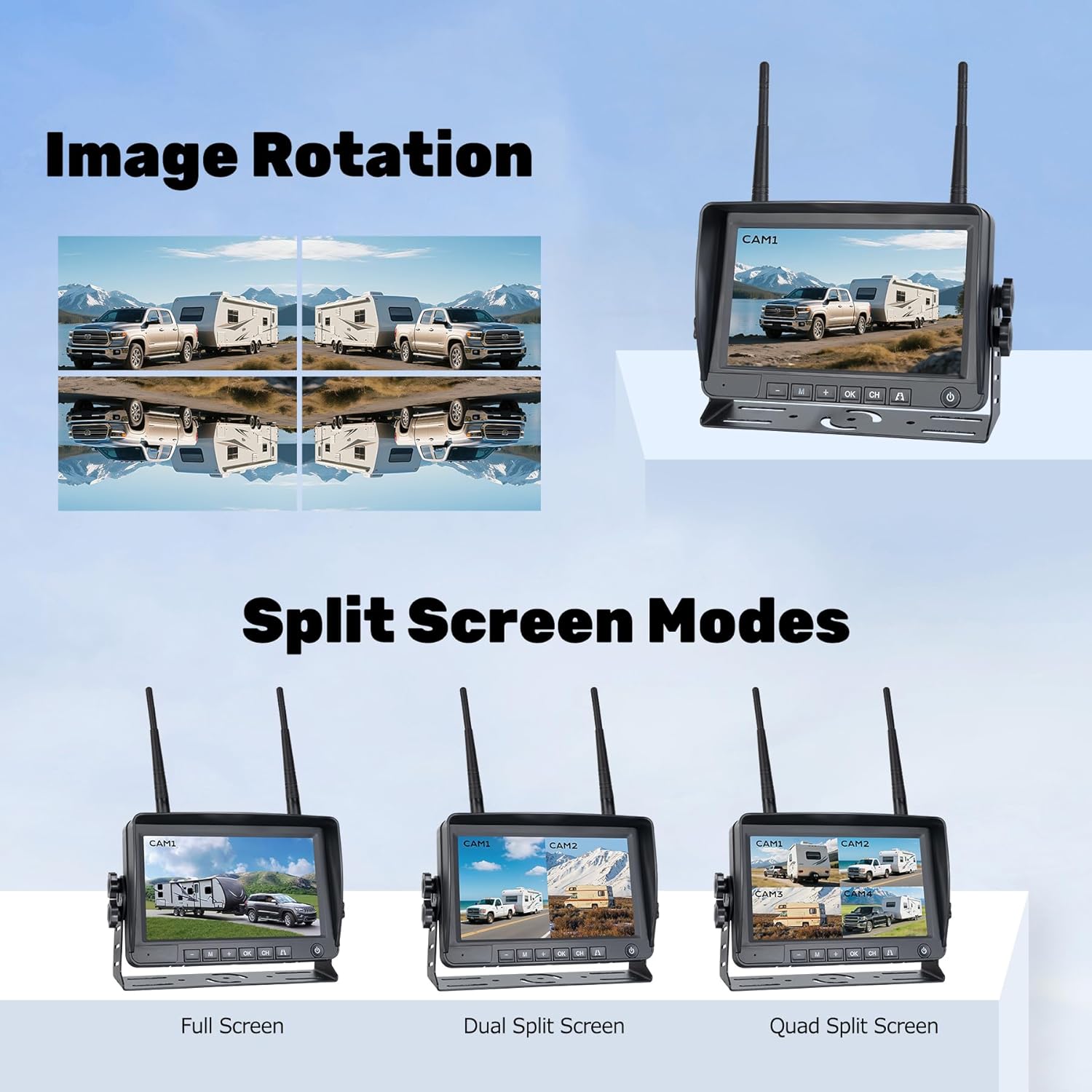 - 【7-Inch 1080P Monitor】 Features a 7-inch full HD (1080P) monitor that delivers exceptionally sharp and detailed visuals. This advanced system supports multi-camera functionality (up to 4 cameras simultaneously) with customizable display modes including full-screen, split-screen (dual), and quad-view options, enabling comprehensive real-time monitoring from multiple angles. For flexible power options, the package includes both a 12V DC vehicle charger and a USB power cable.