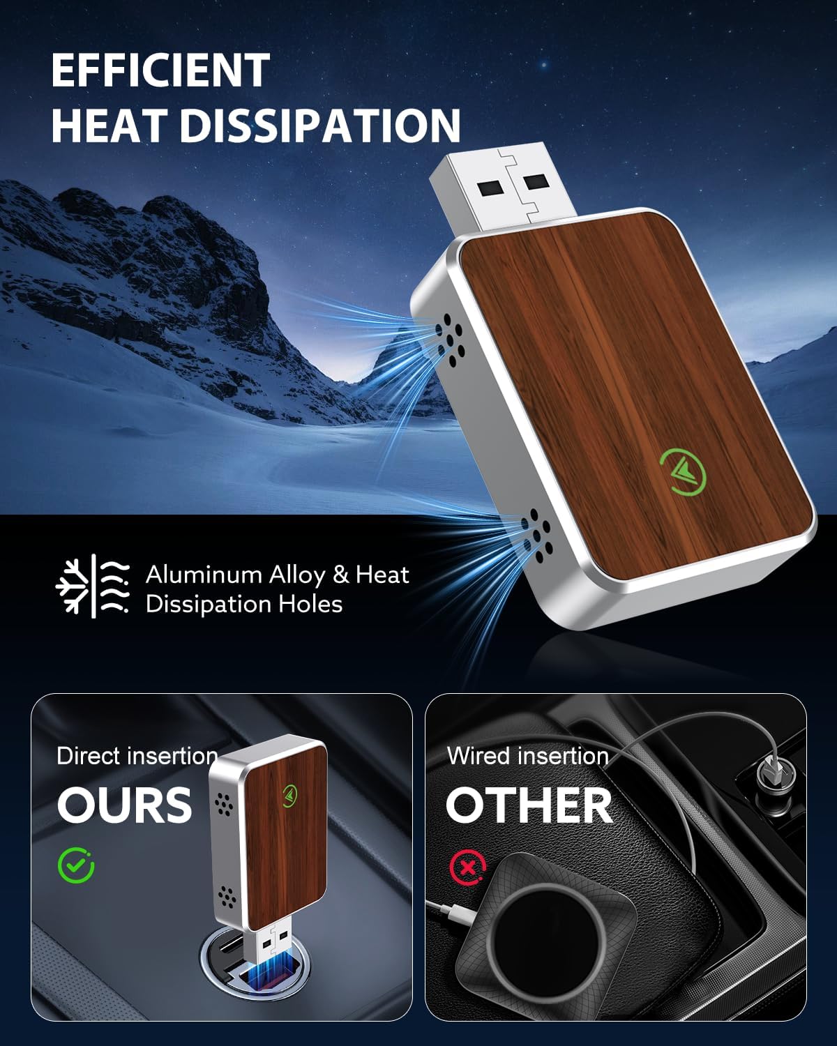- Seamless Wireless Upgrade: Instantly convert your factory-wired CarPlay into a clean, wireless system with this premium adapter featuring a silver aluminum frame and smooth wood grain surface. It retains full functionality—navigation, music, Siri, calls—via your car’s original CarPlay interface. Enjoy cable-free convenience and a polished look that blends into modern interiors without requiring any app or permanent installation.