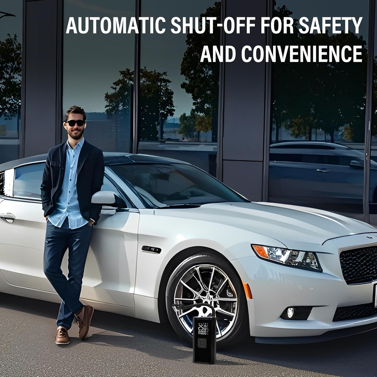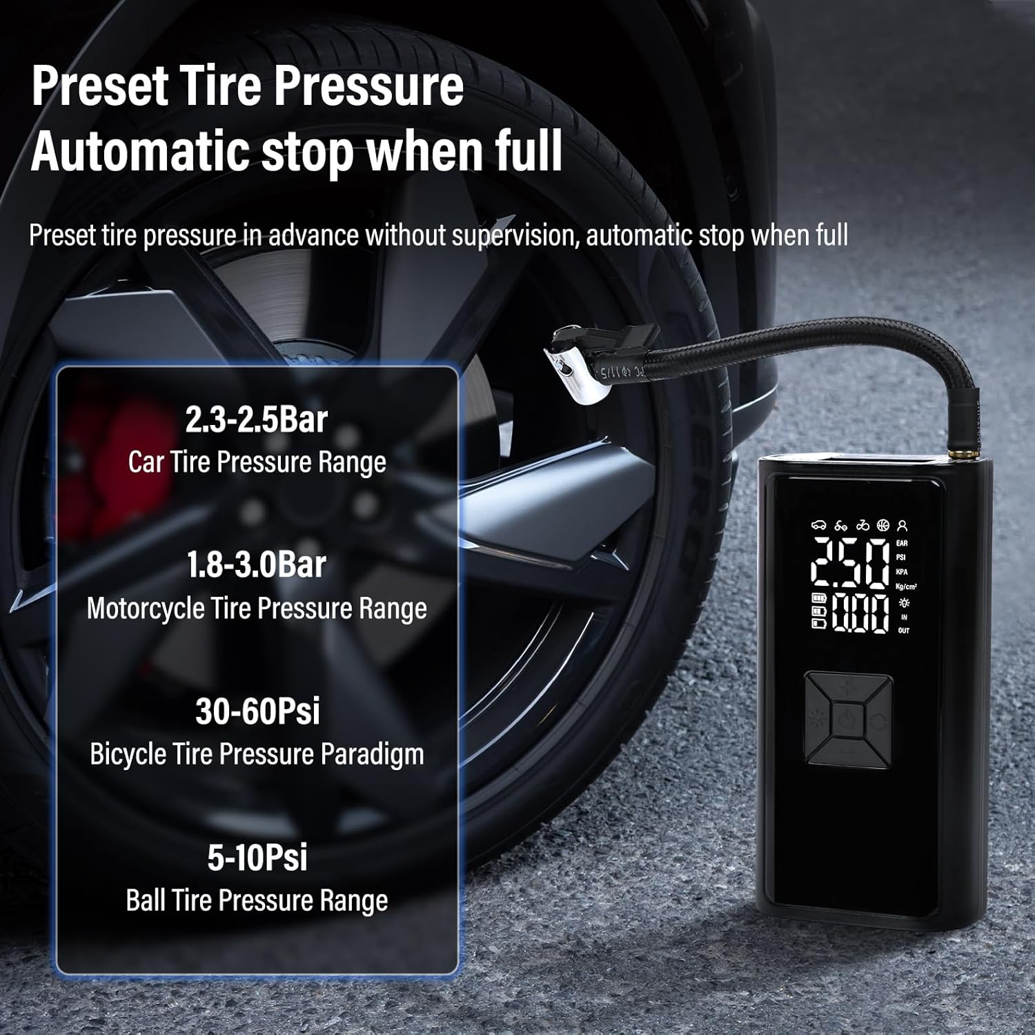 - PRESET PRESSURE, FULL SELF-STOP: Connect the air hose and press the “start” button - the wireless tire inflation pump will automatically inflate to a preset pressure and then shut off to prevent over-inflation, keeping your tires safe and freeing you up to do other things.