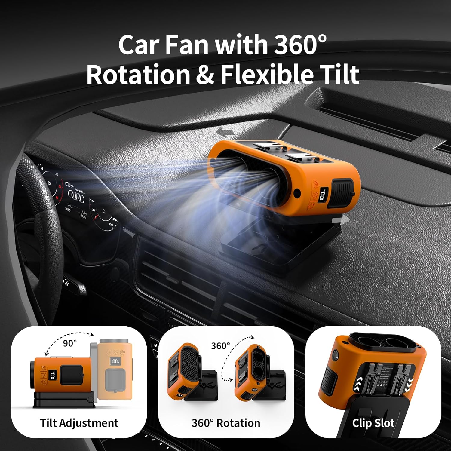 - 【Multi-Angle & Sturdy Metal Clip】Portable car fan features a sturdy metal clip that attaches securely to the car seat headrest and provides 360° rotation and 90° vertical tilt for powerful airflow in all directions. Ideal for car cooling, removing moisture from the windshield, and removing odors while ensuring fresh air