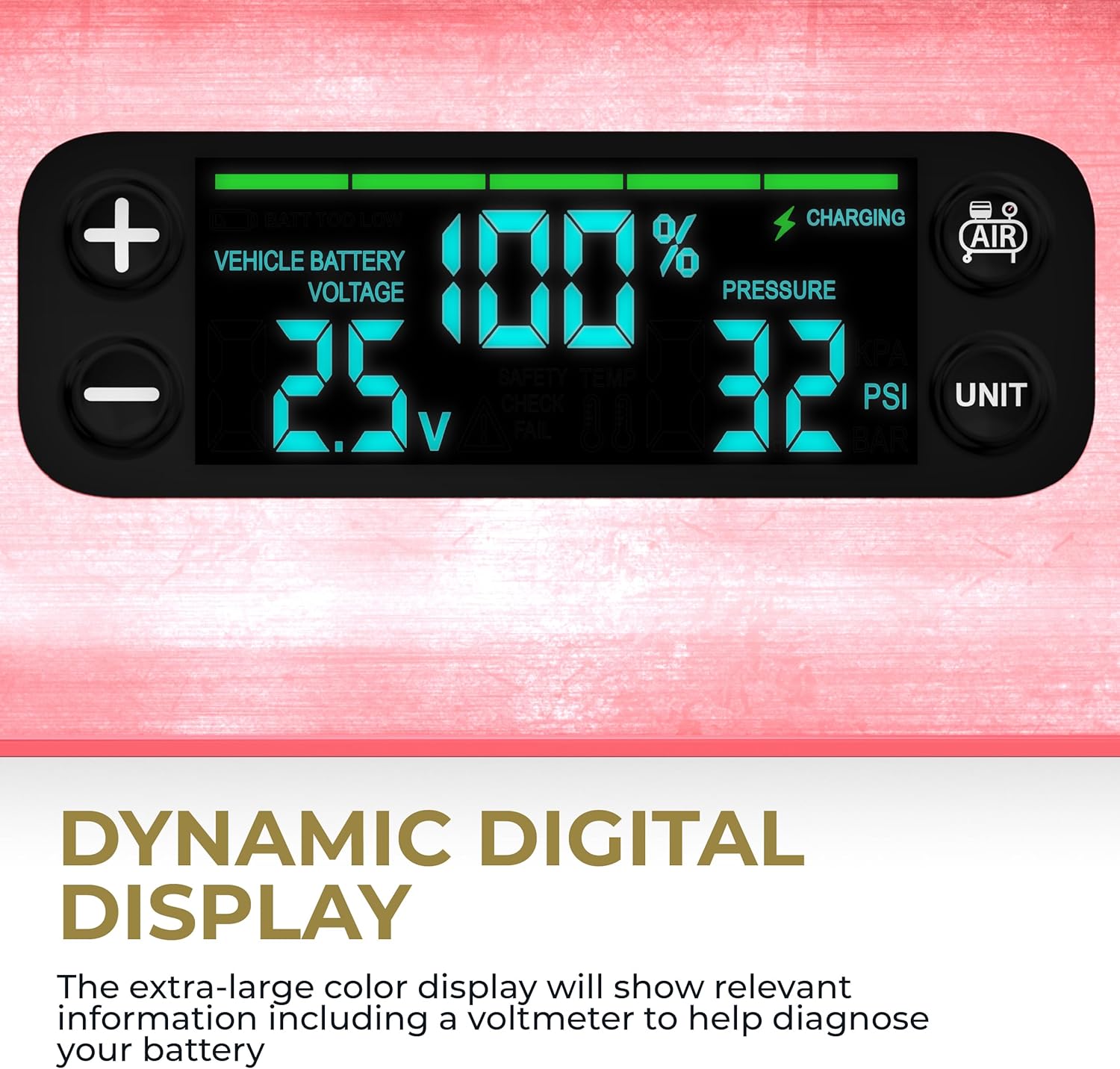 - DESIGN: 4-in-1 Design (Jump + Inflate + Charge + Illuminate), 1500 Peak Amps, Up to 80 Jumps on a Full Charge, 3-Step Jump Start, Spark-Proof Technology, Patented Safety Protection, Integrated Voltmeter, Dynamic Digital Display, Integrated Air Compressor, Precision Air Pressure Control, Bi-Directional USB-C, Pass-through Charging, 3-Way Multi-device Charging, 3-Mode Floodlight (White, Red & Red SOS), Durable Construction. Air Travel Ready