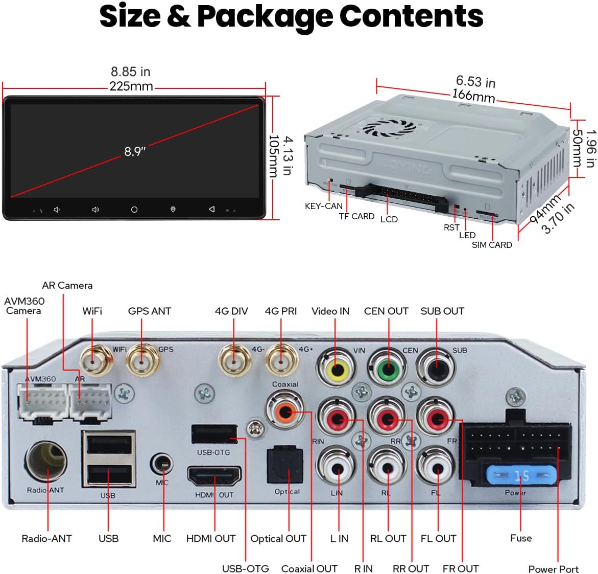 - Included Components : 8.9" radio*1, Single Din Cage*1, Mounting Sleeve*1, Left & Right Bracket*1, Plastic Trim Out*1, Extraction Keys*1, Installation Manual*1, WiFi Antenna*1, GPS Antenna*1, 4G Antenna*2, External Mic*1, USB Cable*2, AR Cable*1, Screen Ribbon Cable*1, ISO Cable *1, User Manual*1 8.9" radio*1, Single Din Cage*1, Mounting Sleeve*1, Left & Right Bracket*1, Plastic Trim Out*1, Extraction Keys*1, Installation Manual*1, WiFi Antenna*1, GPS Antenna*1, 4G Antenna*2, External Mic*1, USB Cable*2, AR Cable*1, Scr… See more