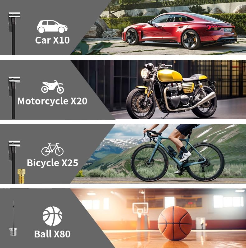 - [Multiple Accessories]The accessories include: 1*Air tube 1*Charging USB cable 3*Inflatable nozzle 1*Anti-scald silicone 1*Ball Needle 1*storage bag 1*Instruction manual 1*Car Cord