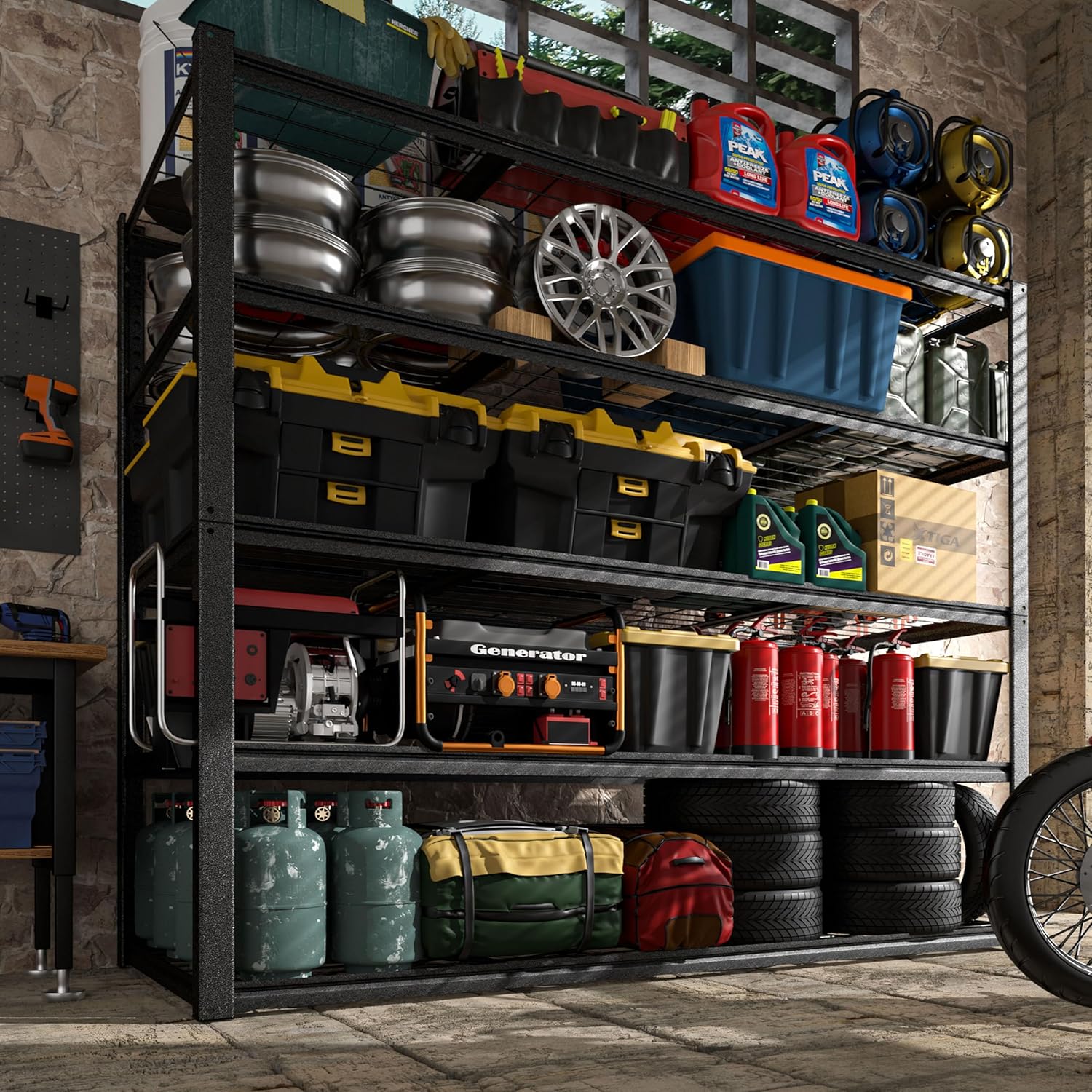- Sturdy and Heavy Duty: 1 pack Garage shelving assembled dimension: 72" H x 47.6" W x 18.1" D, Max Load Per Shelf:600lbs, 5 tier shelves' total max load weight is 3000 lbs. Sturdy metal frame enhanced load-bearing capacity. No wobbling or shaking when fully loaded as this metal shelving has extra support beams which can enhance the stability and durability of the storage shelves.