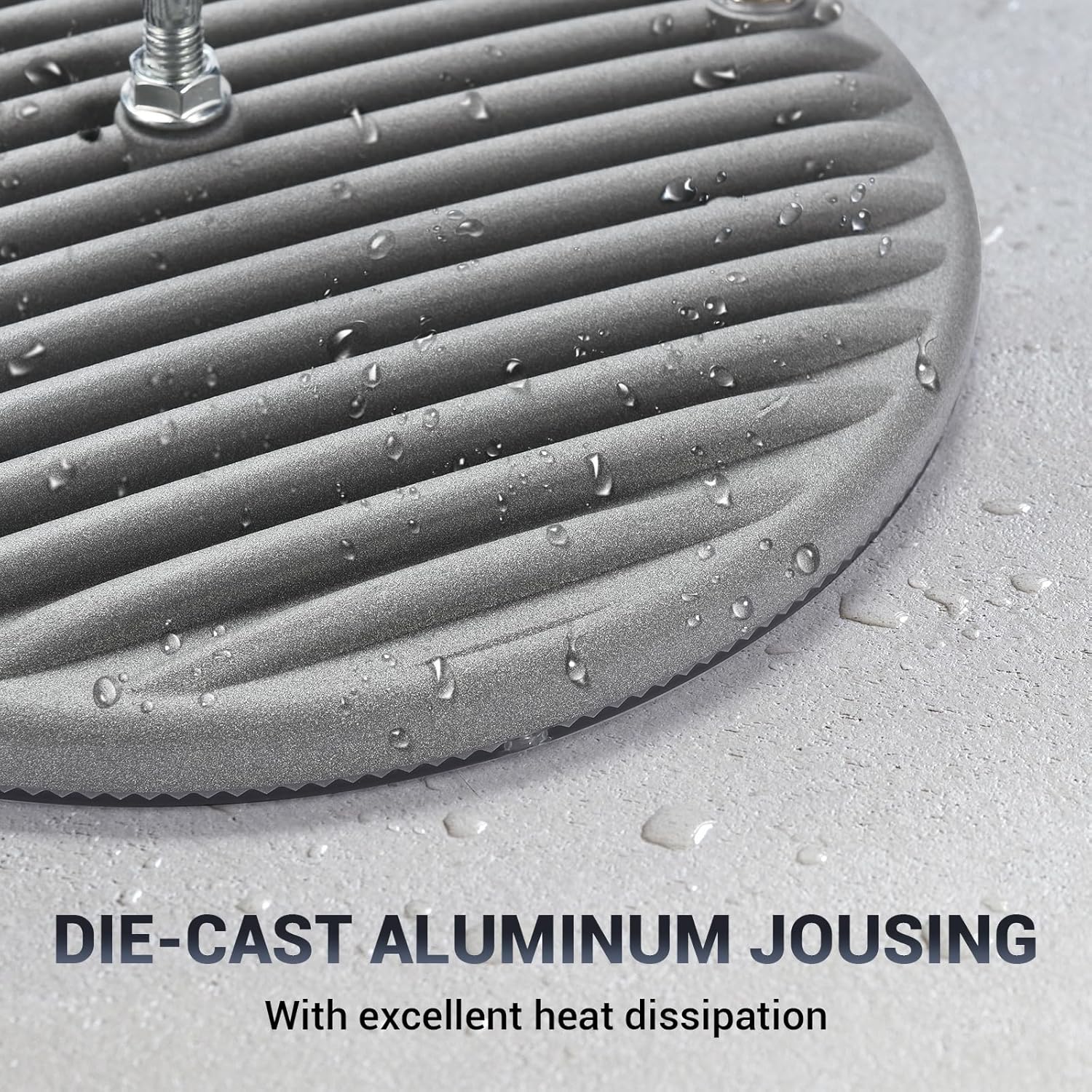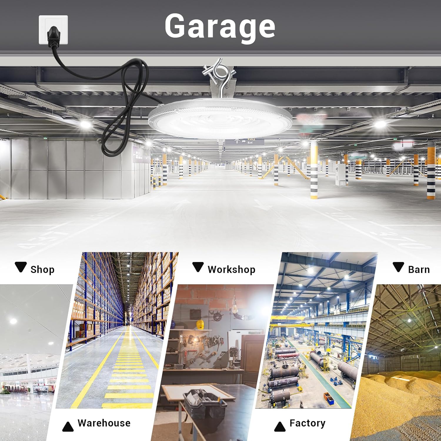 - 【Durable/Long Service Time】This UFO LED high bay light adopted high quality non-flickering driver ensure it over 50,000hours lifespan. It comes with an die-casting aluminum shell which features great thermal conductivity, these make the light durable and excellent heat dissipation. for workshops, barn, gymnasiums, factories, exhibition halls, shopping malls, supermarkets, storage yards, basements and any other large commercial and industrial places.