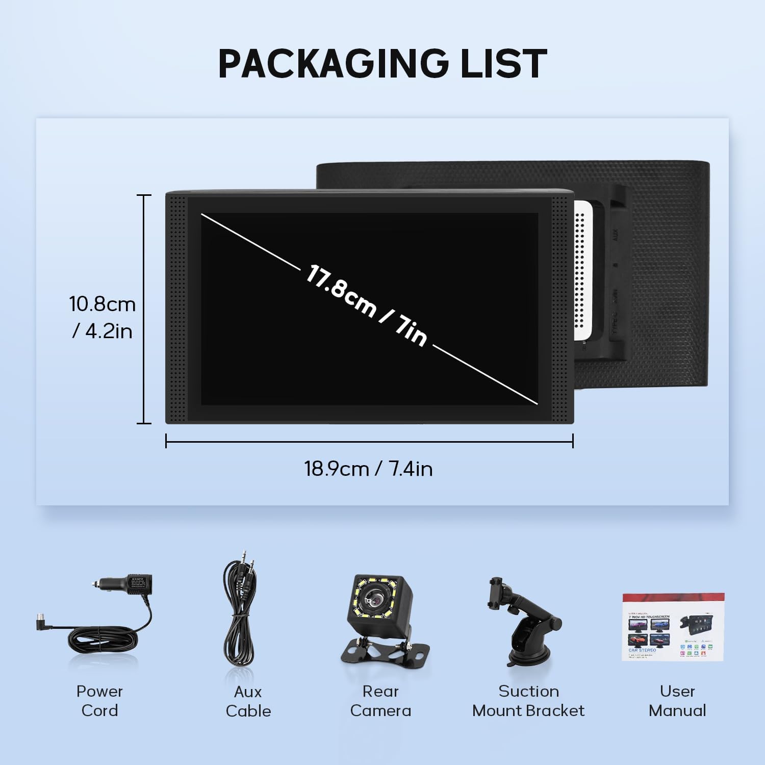 - Multiple Audio Output Modes: car radio has built-in stereo speakers, Bluetooth, FM transmitter and AUX port. touch screen car stereo can be played through the product's built-in speakers or connected to the car stereo system via AUX or FM for hands-free calling