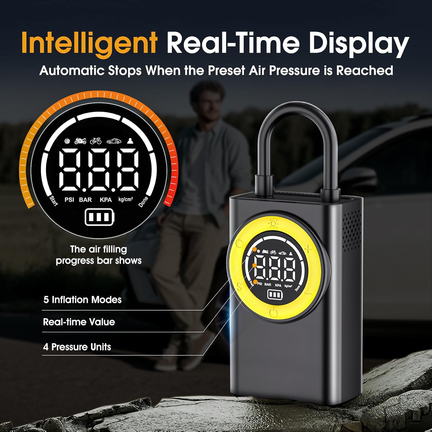 - 【Smart Preset & Auto-Stop】Set your desired pressure (PSI/BAR/KPA) via the liquid crystal display and let the cordless tire inflator work hands-free. Its AI-powered sensor auto-shuts off at the preset PSI (±1.5 accuracy) to prevent overinflation. Includes motor overheating protection for safe & reliable operation
