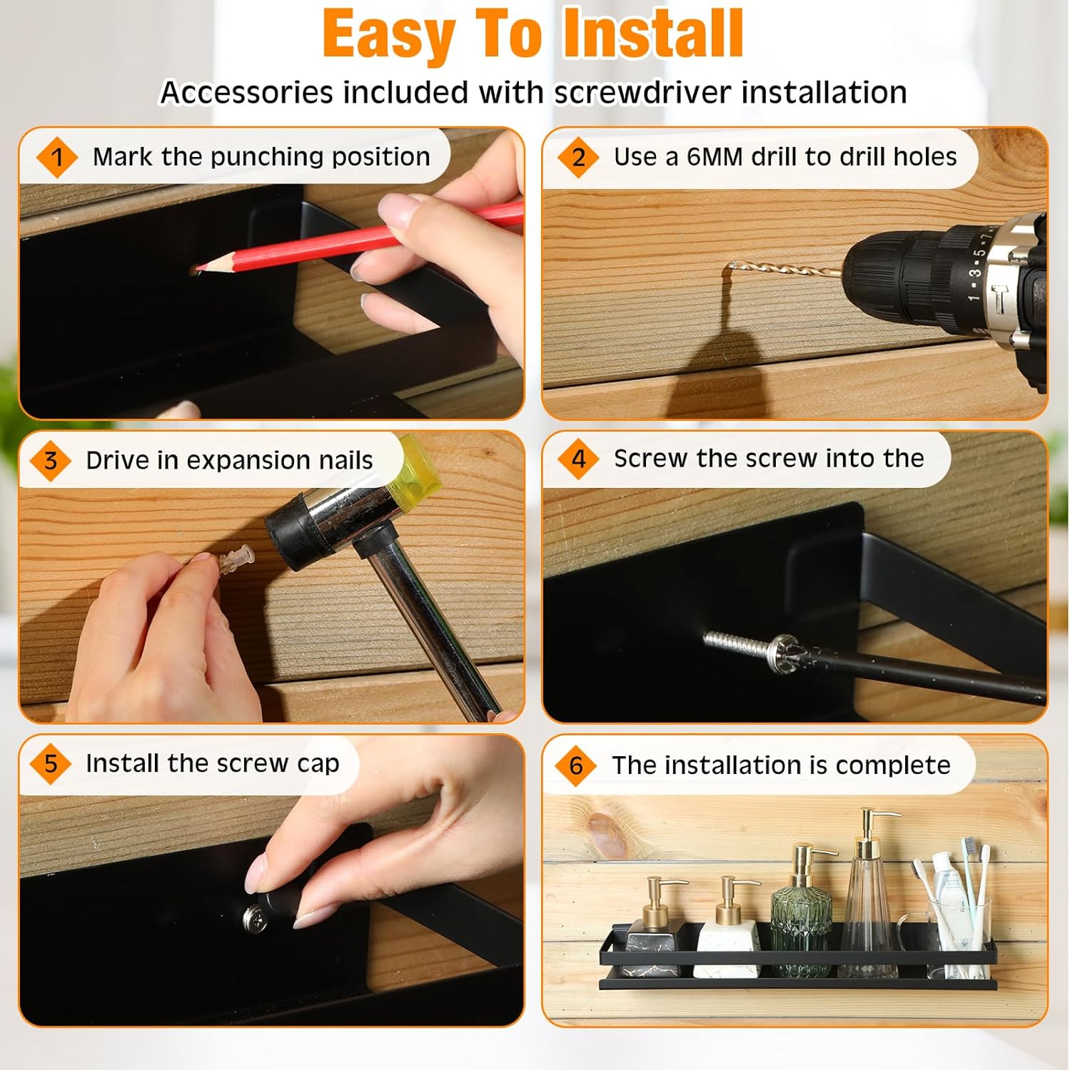- Simple to Install: black shower caddy comes with installation accessories, you need to drill the holes first, then drive in the plastic expansion strips, screw in the screws with a screwdriver (not included), install the hidden cover, and the installation is complete; Hidden covers help hide screws for a more esthetical and pleasing look, both decorative and practical