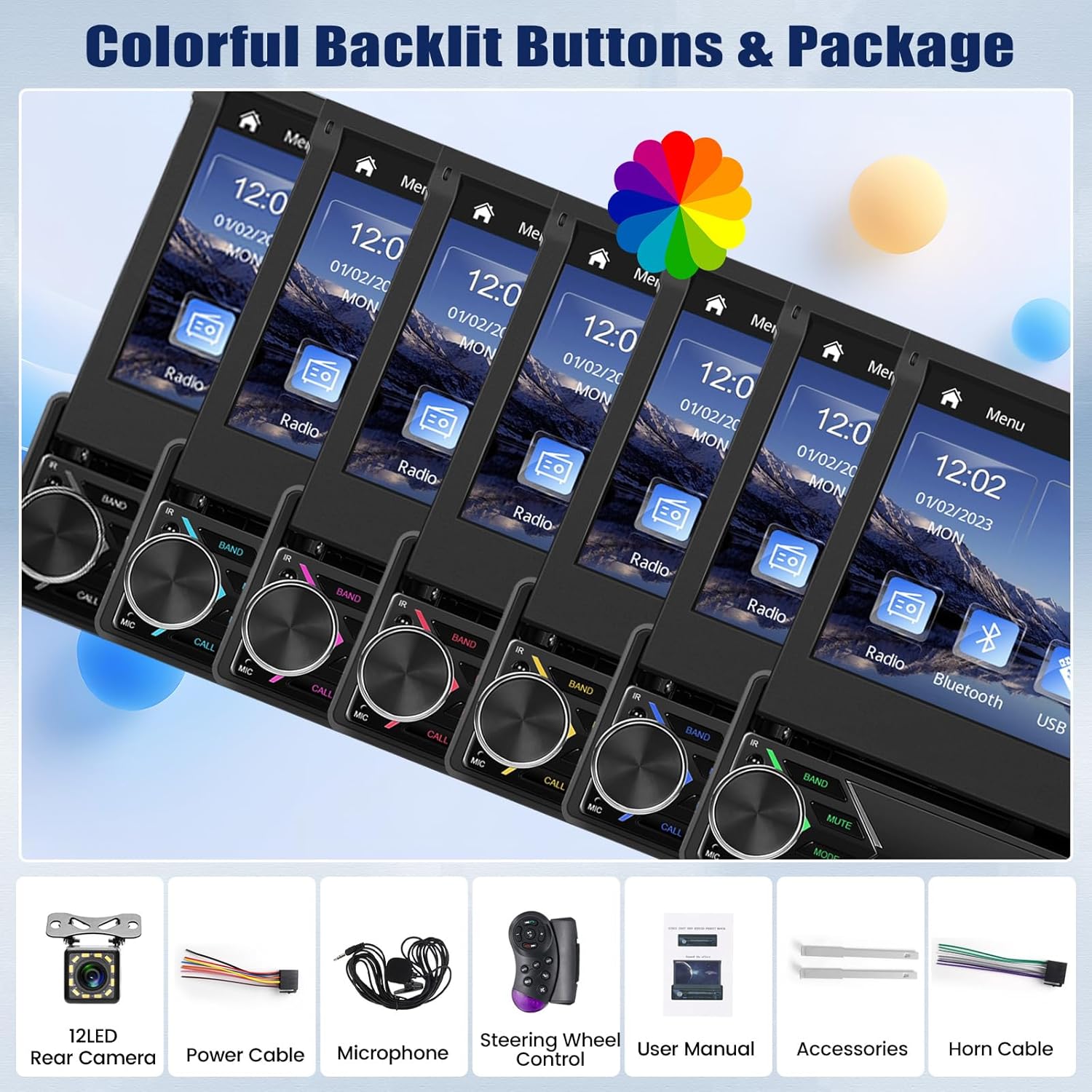 - 【7 Inch Single Din Car Stereo】1 din Touch screen car radio system can closely integrate the user's mobile phone and player, and access mobile phone address book, mail,map navigation,music,video and other information.7 Inch HD digital auto retractable 1024*600 capacitive LCD touchscreen car radio,with dynamic menu interface,builds in high quality stereo audio,with USB,UI color adjustable,SWC, rear camera input. Installation size: 183*50 mm,universal for single din cars, can fit most vehicle