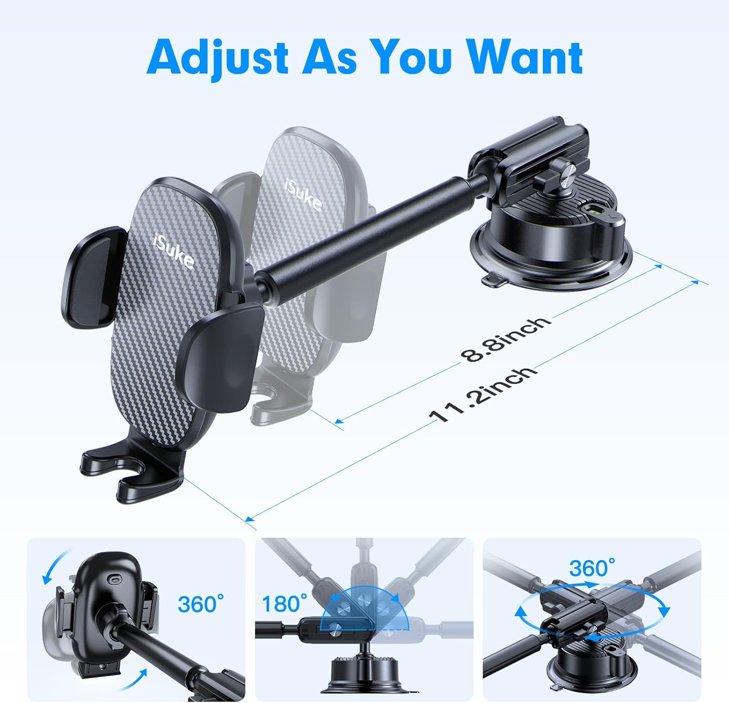 - [Unobstructed View] isuke cell phone car mount features a flexible 360° ball joint and an adjustable extend arm, allowing you to easily switch between portrait and landscape view, convenient navigation and answering calls. Super stable phone holder for car ensuring that you can keep your hands free and your eyes on the road, making for a safer and more comfortable driving experience.