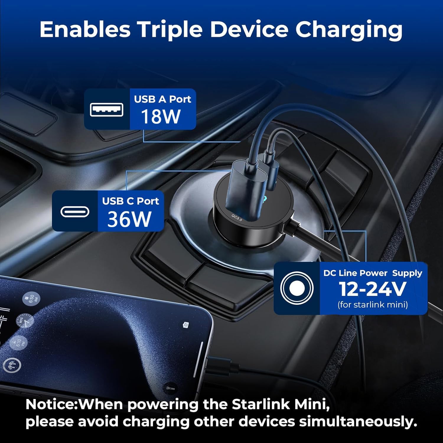 - 【Dedicated Power for Starlink Mini in Cars, Trucks, RVs】: This Starlink Mini cable Specifically designed for Starlink Mini and Starlink Mini Accessories ensures a stable 12.8V-24V power supply in vehicles like cars, trucks, RVs, and boats. The DC plug is a dedicated connector—do not connect to other devices to prevent damage. Equipped with USB-C PD 36W and USB-A QC 18W ports, avoid simultaneous charging of other devices while powering Starlink Mini for optimal performance