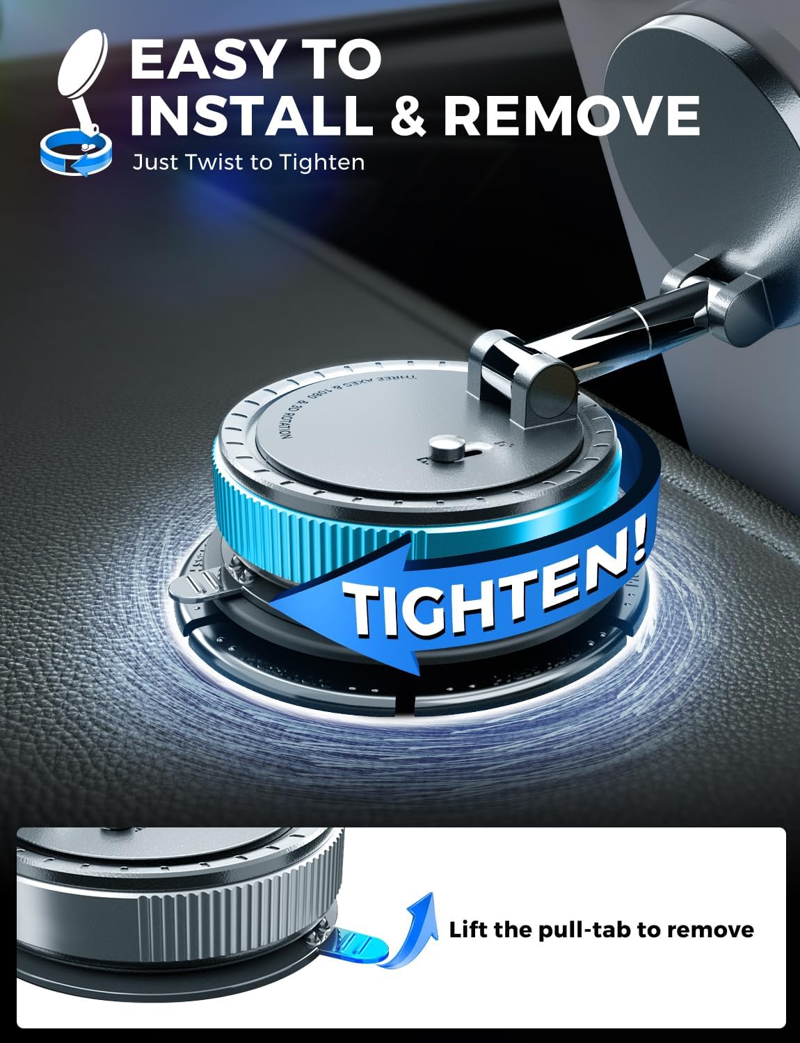 - 【Easy to Install & Remove】This vacuum magnetic phone stand features a one-step installation—simply press the base against any smooth glass surface and twist to lock it in place. To remove, just twist in the opposite direction to release the mount. 🛠️Pro Tip: When mounting on the dashboard, always apply the included 3M adhesive mounting disc first—it creates a smooth, stable surface for stronger and more reliable suction.