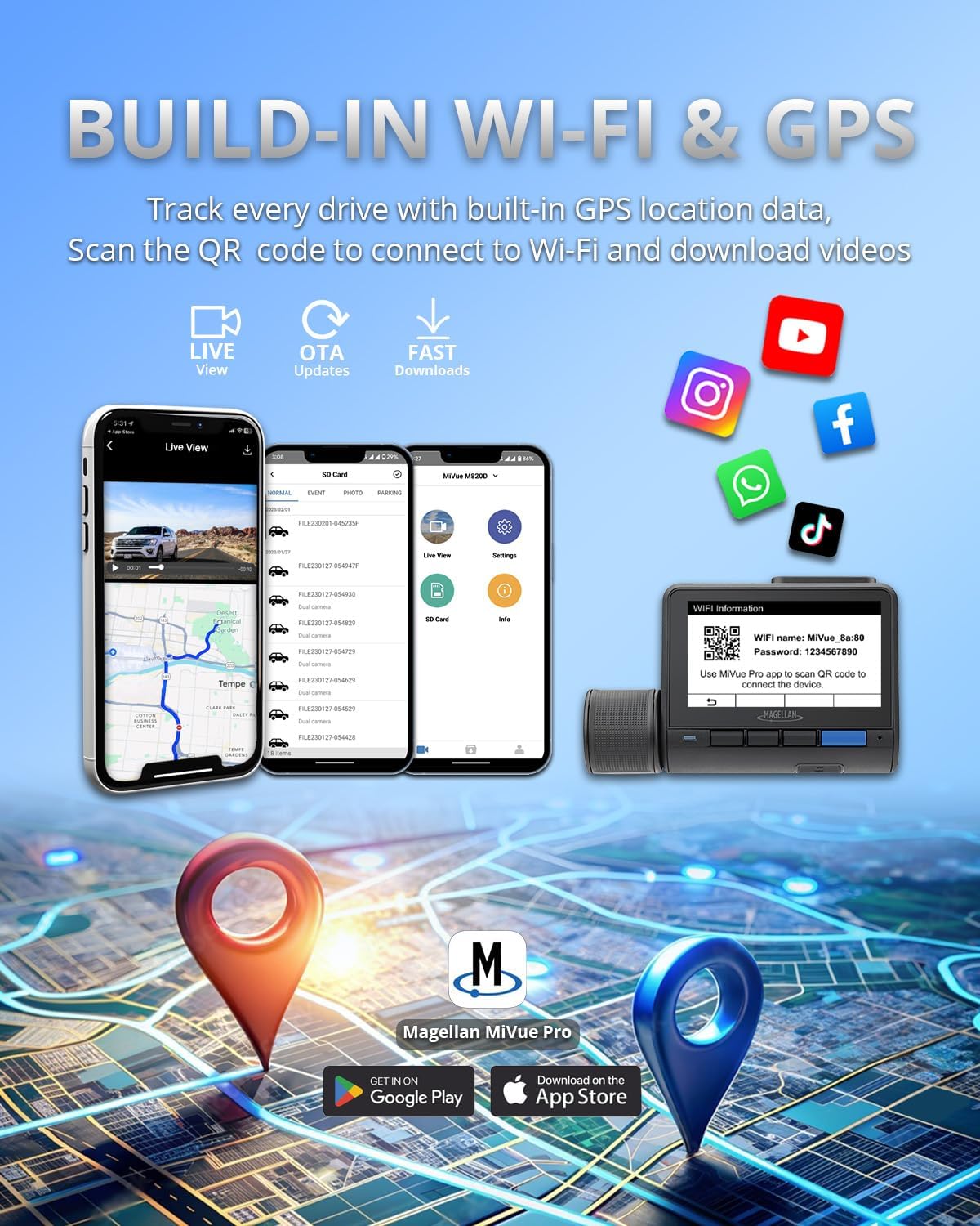 - 【Built-In Ultra-Precise GPS】Track your route, speed, and direction using high-accuracy GPS powered by four satellite systems: GPS, GLONASS, GALILEO, and QZSS. Perfect for insurance claims and road safety reports, GPS data is embedded directly into your videos and viewable through the Magellan Mivue DR50 Pro App.