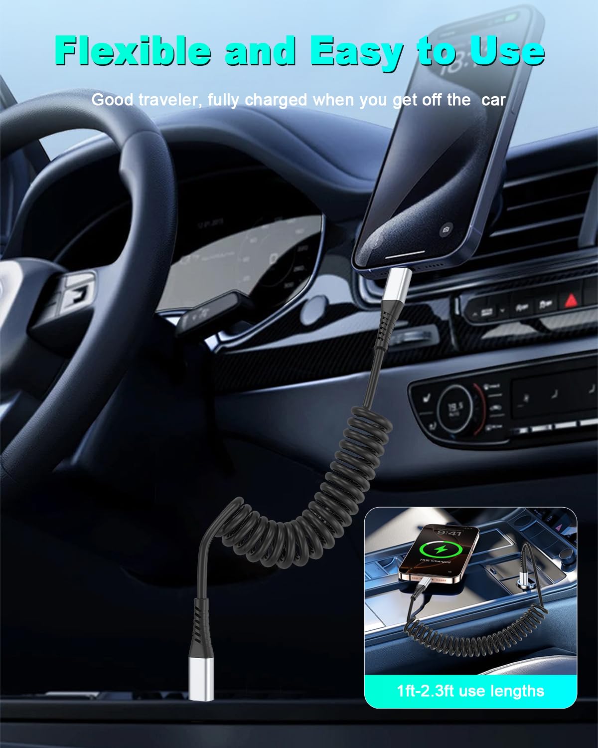 - 【USB C Cable for Car】: Coiled USB C charger cable has an effective stretch length of 1.5 feet to 2.3 feet (maximum 3 feet), flexible length for every situation. No tangles or knots, retractable and easy to carry, fits in a bag or the front seat of a car.