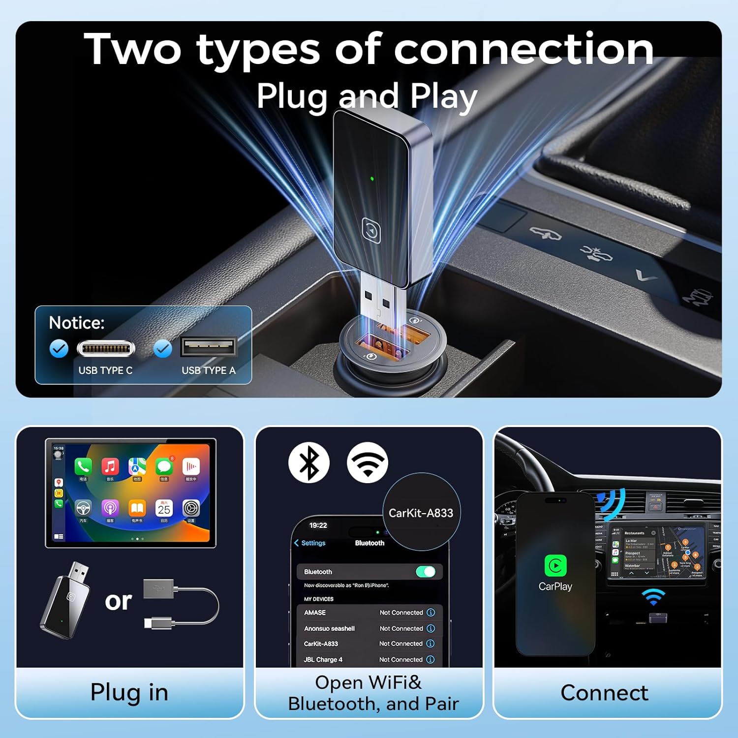 - 【Wide Compatibility & USB-A and USB TYPE C Dual Port】BDFFLY wireless carplay adapter is perfectly compatible with more than 800 models with built-in for Apple CarPlay or Android Auto system. Compatible with iOS 10 and above iPhone and Android 11 and above. In addition, for apple carplay wireless adapter is equipped with USB to USB-C converter, which can perfectly fit USB-A and USB TYPE C car ports. (Tips: Please don't buy it if your car doesn't have CarPlay/Android Auto function.)