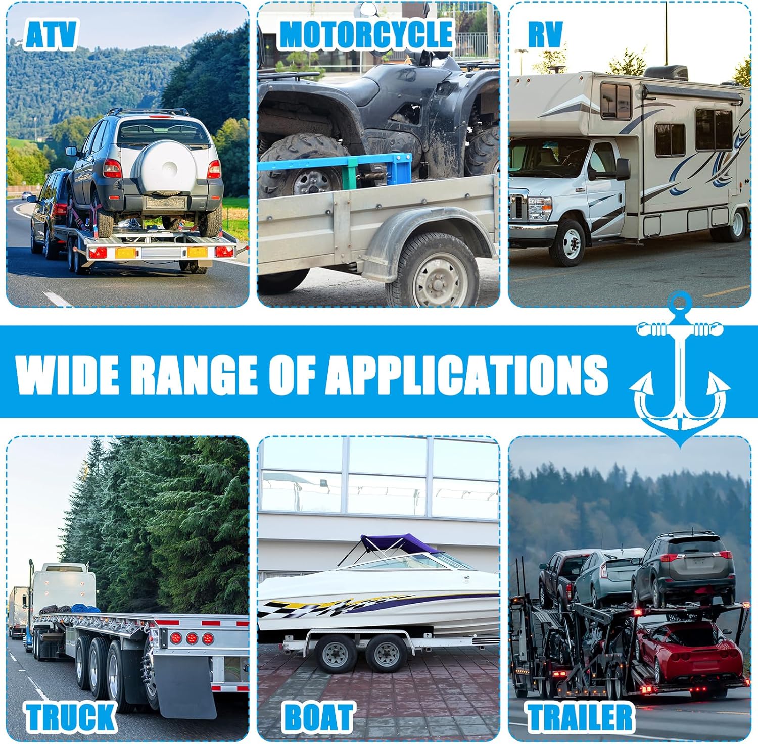 - Wide Applicability: made to fit a variety of situations; Whether you're towing a car, truck, sedan, coupes, sport, ATV, UTV, or a boat, these straps will serve you well; These straps for trailer's size and strength make them ideally suited for both recreational and commercial use