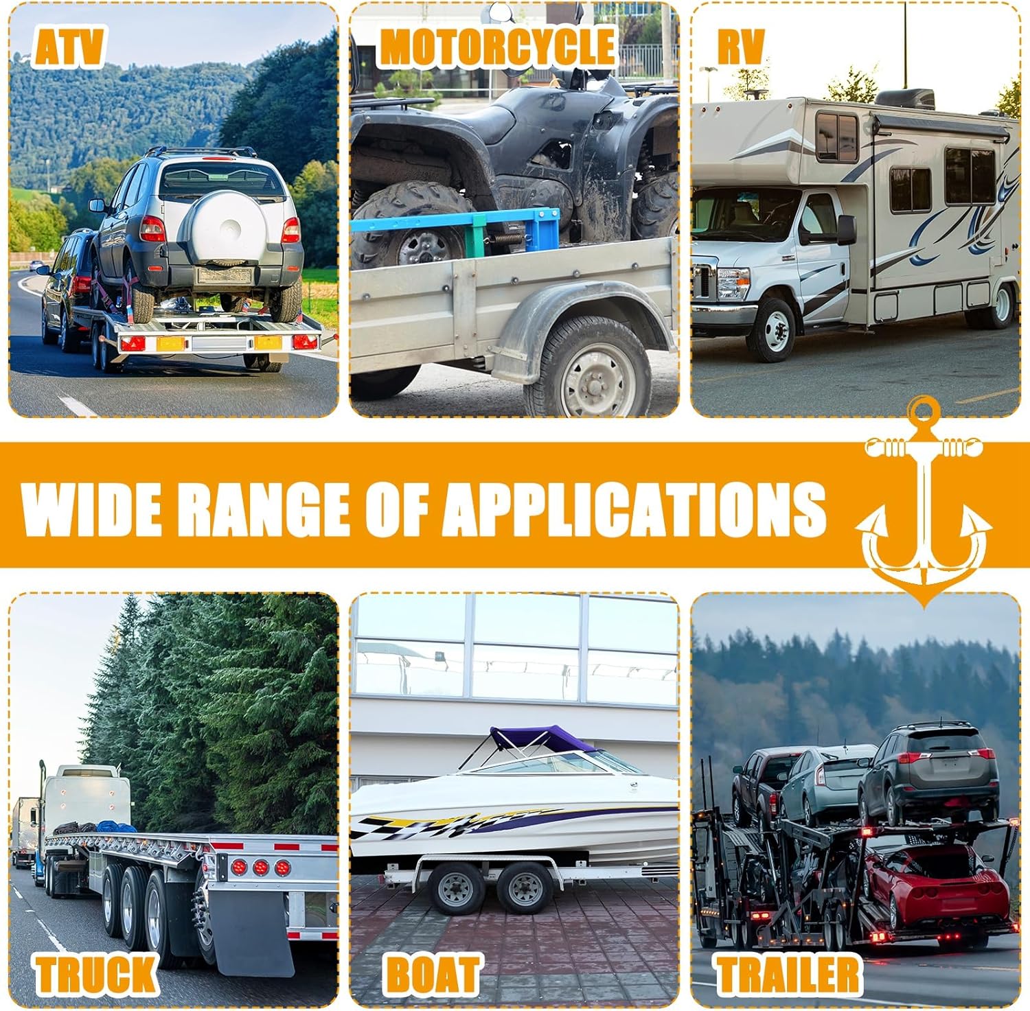 - Wide Applicability: made to fit a variety of situations; Whether you're towing a car, truck, sedan, coupes, sport, ATV, or a boat, these straps will serve you well; These straps for trailer's size and strength make them ideally suited for both recreational and commercial use