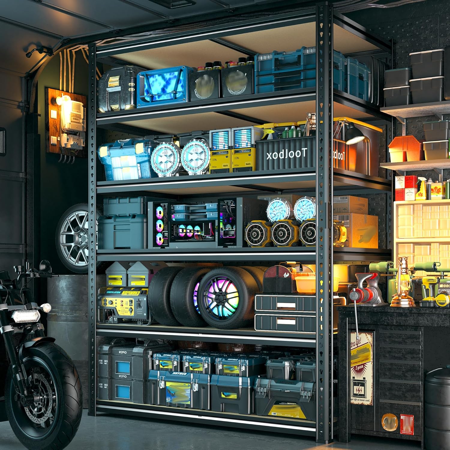 - 【Safe & Sturdy Rolled-Edge Construction】The shelves' thickened steel columns feature smooth edges that protect hands from sharp corners while reinforcing structural durability. The industrial-chic rolled design adds sleek aesthetics to garages, workshops, or pantries — safety and style united