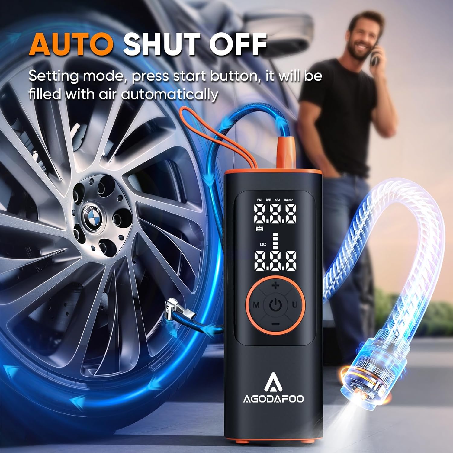 - [4+1 Intelligent Modes] : Tire Inflator Portable Air Compressor is equipped with dual displays for easy reading of preset tire pressure values and real-time pressure values.4 preset inflation modes: bike, motorcycle, car and ball. This cordless tire inflator will automatically shut off when it reaches to avoid the hazards of over-inflation. The manual mode also allows you to set the pressure value (3-150 PSI) depending on the object to be inflated. The air pump comes with 4 different nozzles for all your inflation needs.