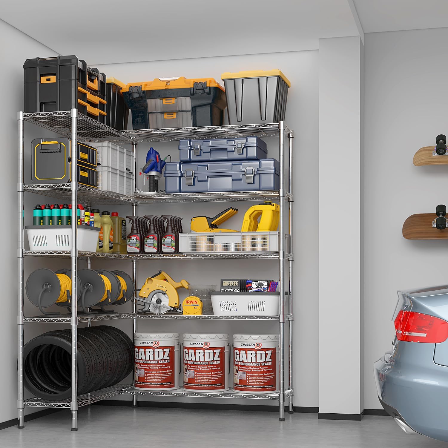 - 【Exceptional 1430 lbs Load - Bearing】Constructed with a dense grid steel frame and reinforced metal supports, this garage shelving is more stable and durable than ordinary racks. With a single - shelf capacity of 286 lbs and a total load - bearing of 1430 lbs, it is rock - solid.