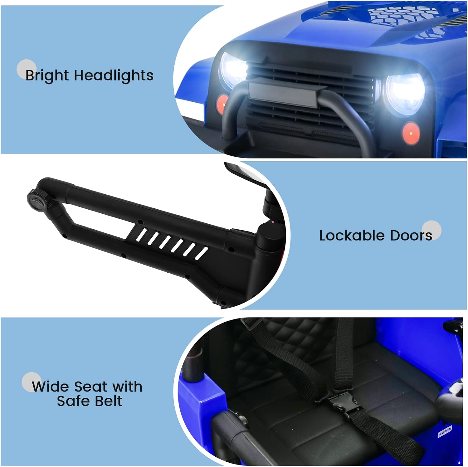 - Safety as First Priority: The kids car is equipped with the soft start function and rear wheels spring suspension to protect your children. Adjustable seat belts and safety door locks also keep the kids safe. Max Weight Capacity: 66 Ibs
