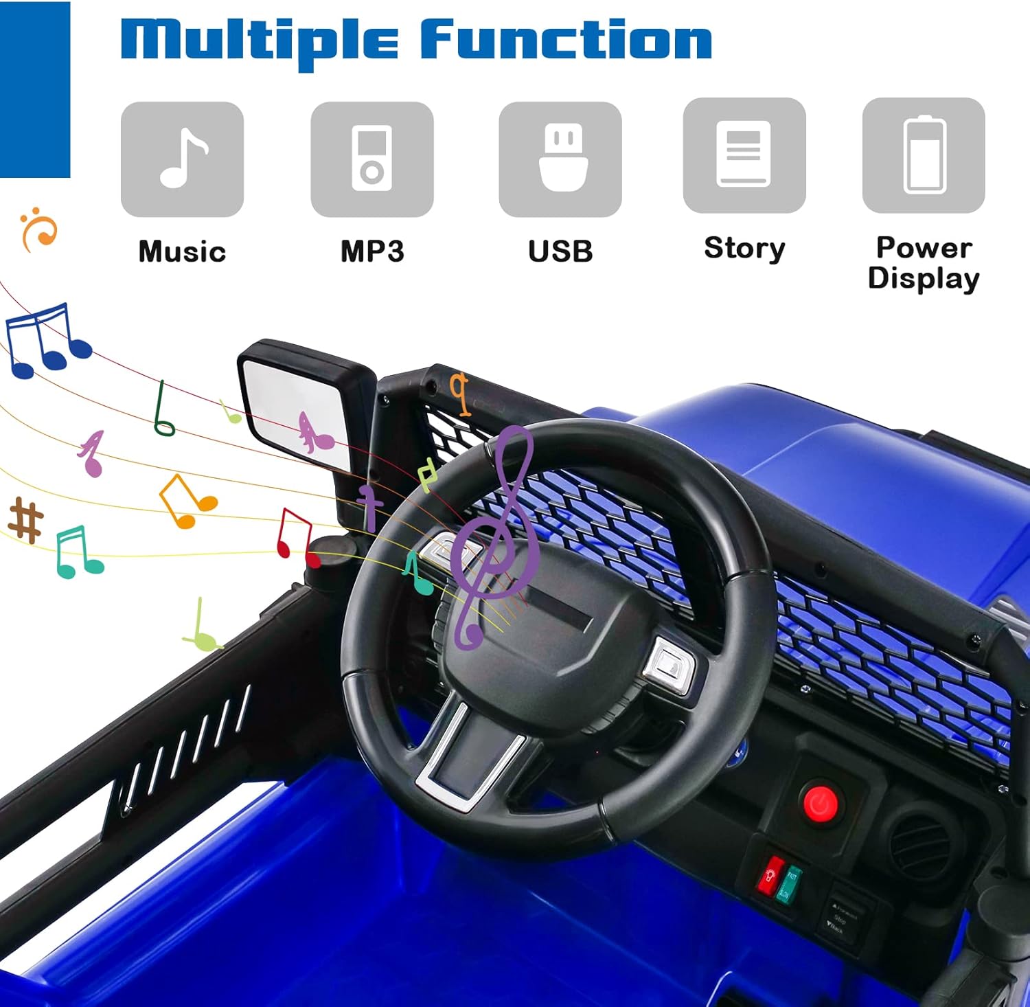 - Multiple Attractive Function: The electric car for kids comes with built-in music and story, a speed change switch, horn button and battery indicator. Besides, USB, TF and MP3 slot can play your own music. When the power is low, the low-voltage alarm function will remind by flashing lights, and the control panel also adds an additional battery voltage display