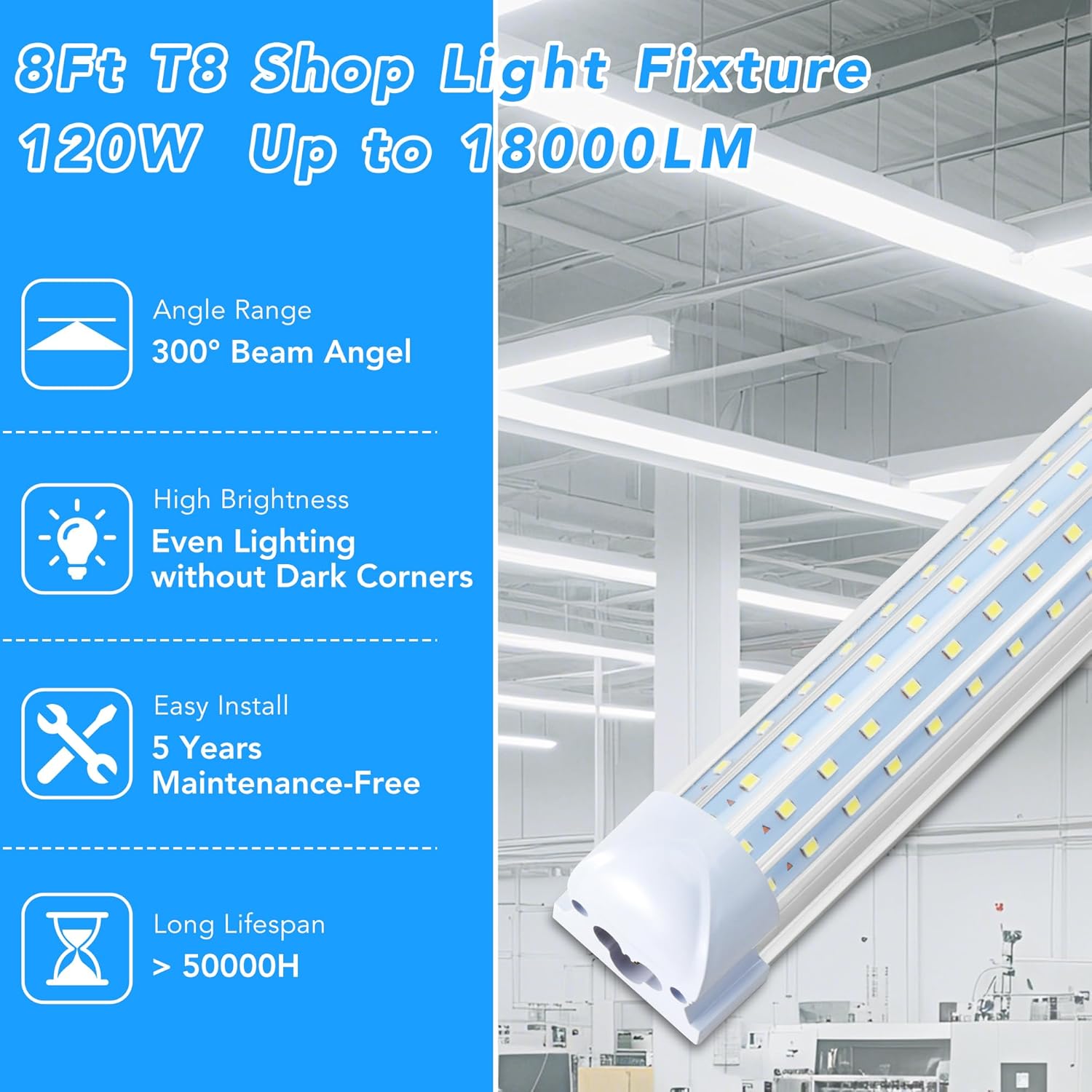 - [Ultra-Bright 300° V-Shape LED Shop Lights]Get commercial-grade brightness! Our 8FT LED lights feature 160LM/W & a 270° V-shape design for uniform, flicker-free daylight (6000-6500K). Perfect garage led lights or workshop led light fixture, illuminating every corner. Outshines fluorescents, slashes energy costs.
