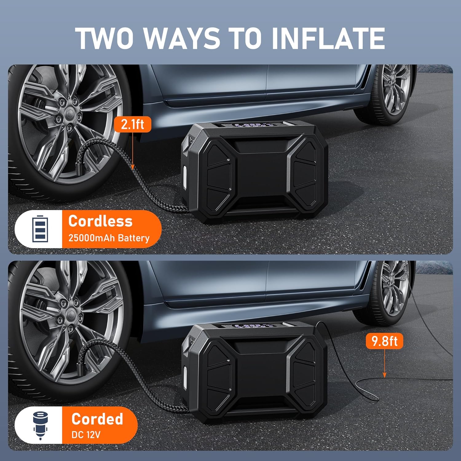 - 40s Fast Inflation: Built with premium materials, our portable air compressor delivers up to 150 PSI, inflating each tire within 40 seconds (30-36 PSI). It can quickly inflate cars, SUVs, motorcycles, bicycles, balls, and other inflatables.