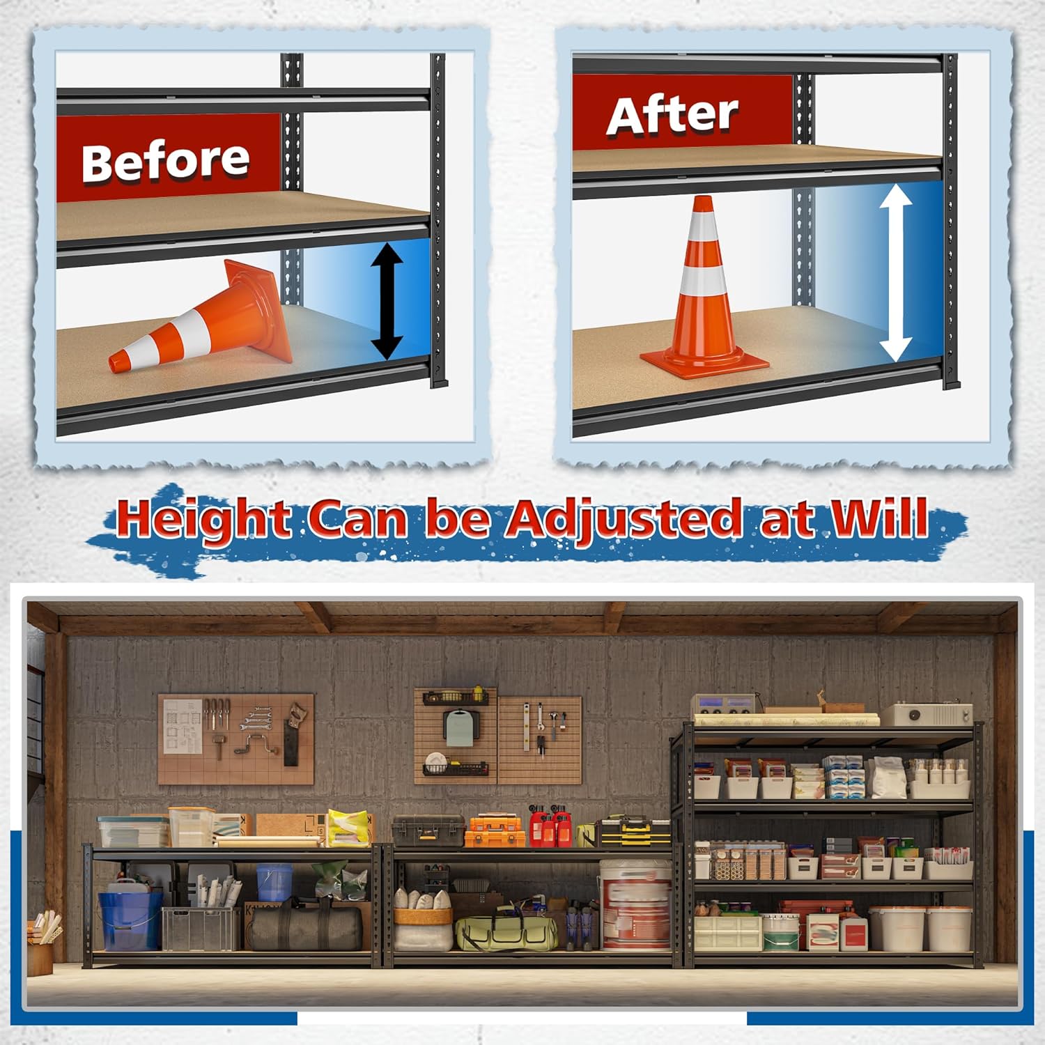 - 【Modular Adjustable Storage Shelving System】 Customize this industrial shelving system to meet specific storage requirements. The shelving unit features tool-free connectors, allowing vertical repositioning of cross braces for tier-height adjustments. This design accommodates items of varying dimensions and enables you to assemble or disassemble our metal shelving into two different units