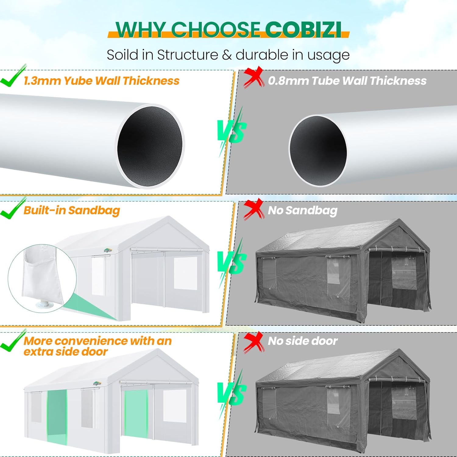 COBIZI Carport Canopy 12x20 Heavy Duty Portable Garage with Removable Sidewalls & Doors, Galvanized Frame Car Port Canopy Tent with Built-in Sandbags & All-Season Tarp for Car Boat Truck, White