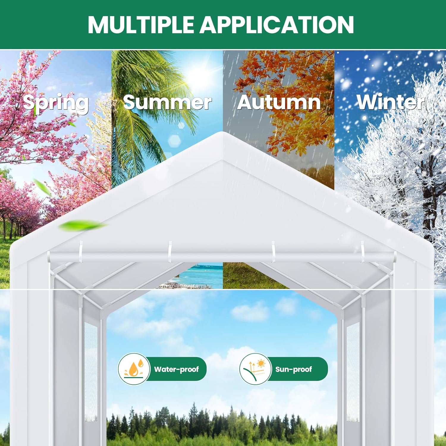 - 【Built to Last】 Constructed from 180g PE tarpaulin, the carport canopy withstands sun, rain, and dust year-round, providing full protection for your car or boat. It is securely attached to the frame with bouncy balls, stable support feet, ground nails, and wind ropes, ensuring durability in all seasons.