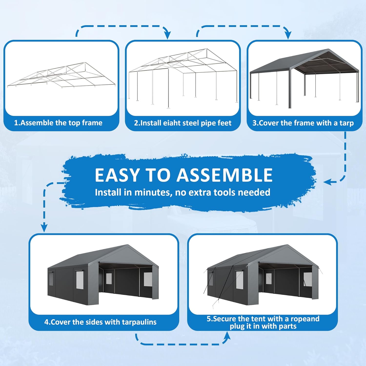 - 【Large Capacity Carport】Carport size is 240''L x 240''W x 144’'H, the large portable garage provides plenty of space for you to park your car or other vehicles, and you can even use it as a temporary storage, it is versatile, lightweight and durable, perfect for vehicle storage, outdoor activities, exhibitions, weddings and other various occasions.