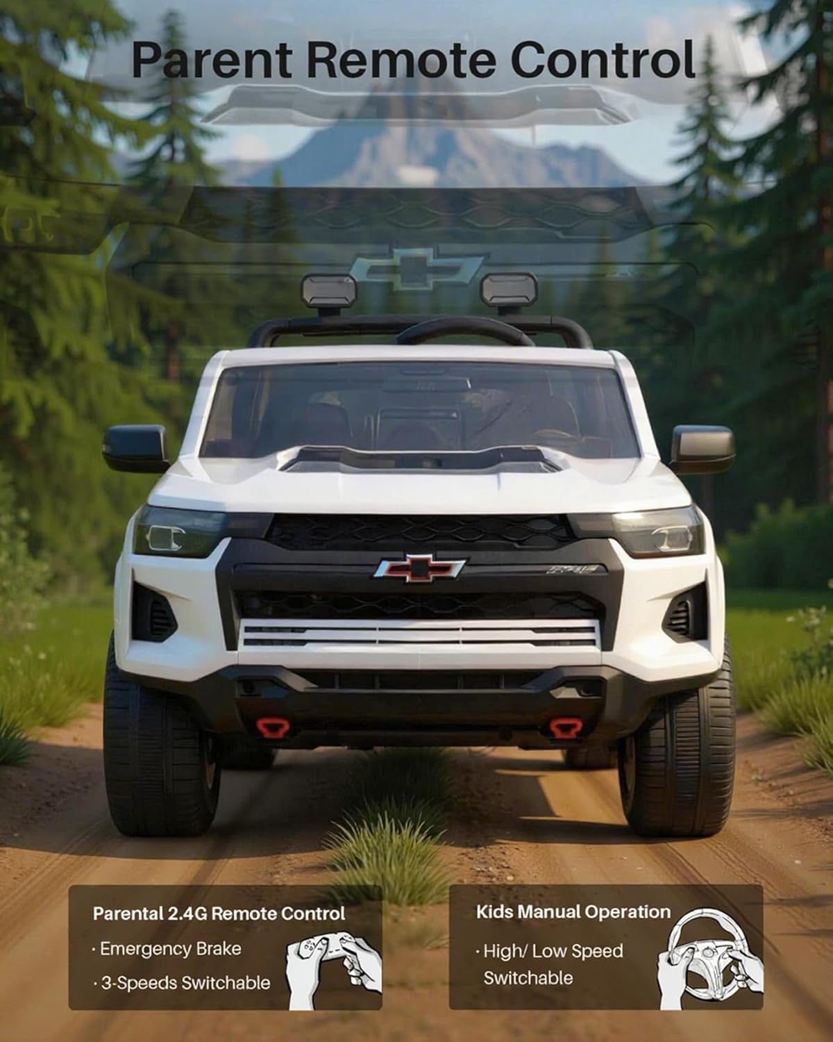 Joywhale 24V Ride on Truck 4WD Kids Electric Vehicle Licensed Chevorlet Ride on car with 7AH Big Battery, 320W Powerful Motors. 2 Seats, Music, 4 Wheel Suspension, 2 Speeds, LED Lights, White