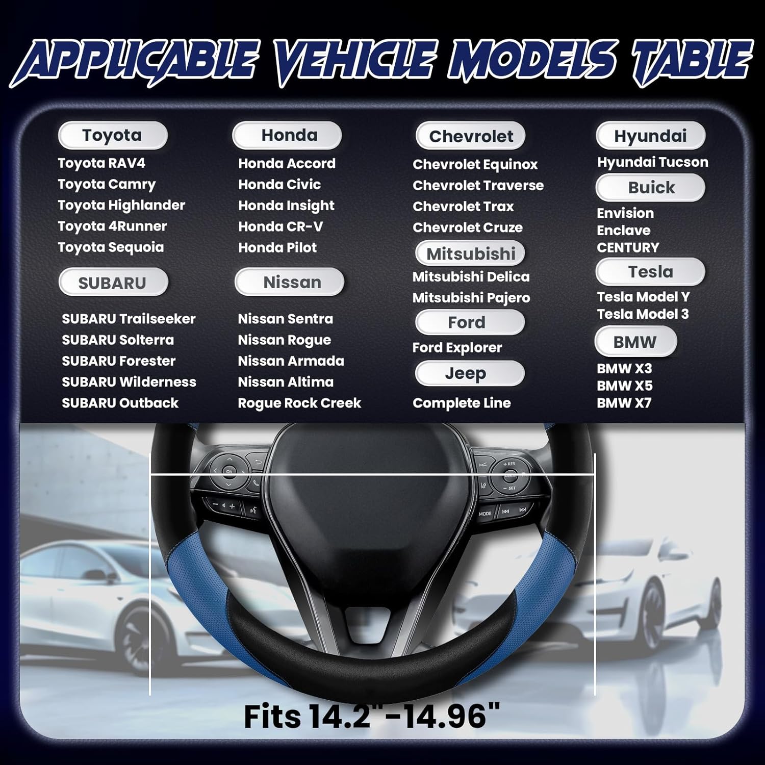 - FITS VARIOUS CAR MODELS :Perfectly compatible with Ford, Toyota, Tesla, Honda, Nissan, Chevrolet, Buick, Subaru,Volvo, BMW, Wrangler, Jeep, Hyundai, Mitsubishi 14.2-14.96 inch round steering wheel.