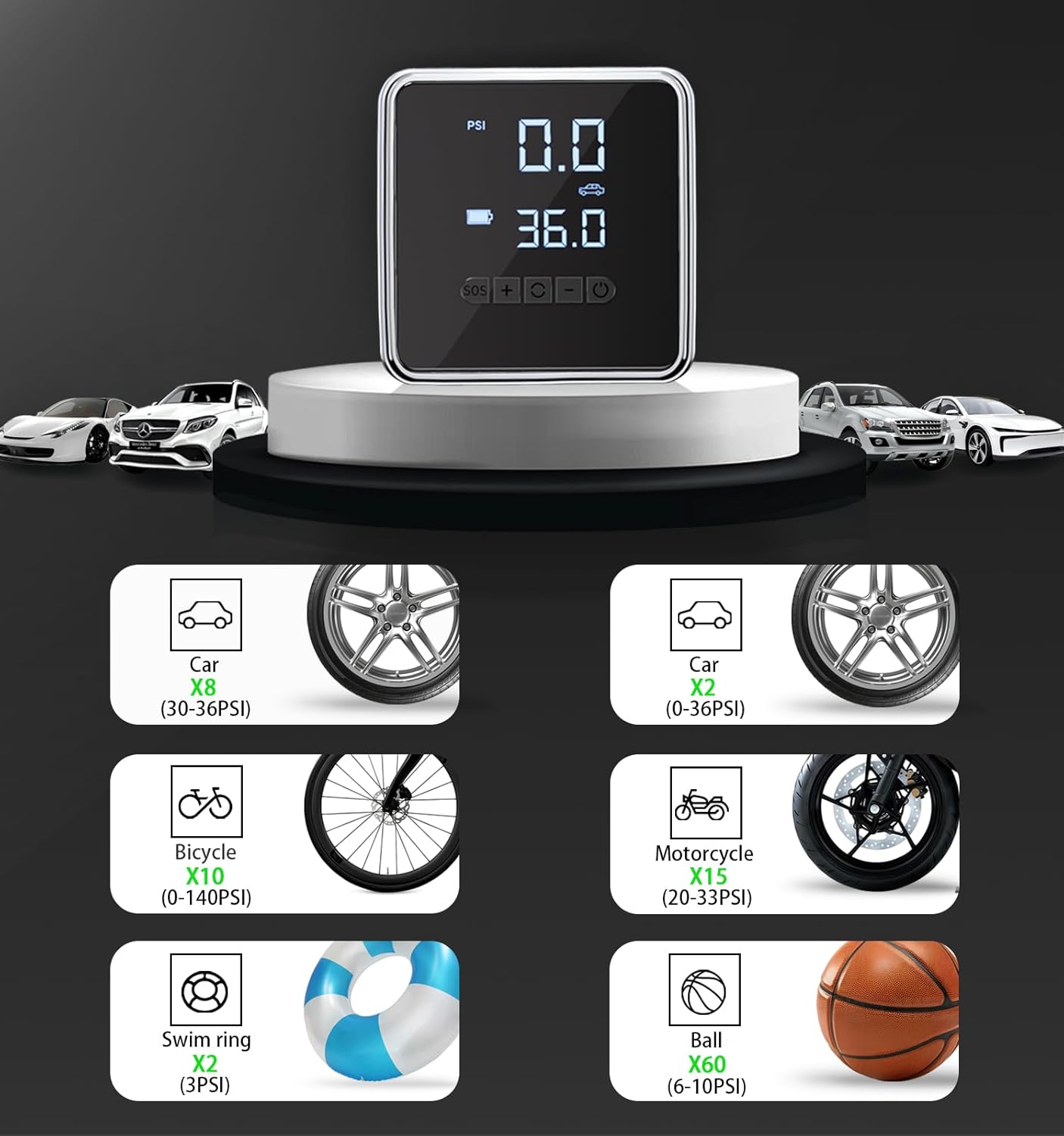 - Fast Inflation & Memory Function: This portable air compressor for car tires has a max pressure of 150 PSI.which can quickly inflate cars, motorcycles, bicycles, trucks, RVs, etc. This portable tire inflator for cars can pump up a standard car tire from 29 to 36PSI in less than 1 minute.The smart air pump has a convenient memory function, which will automatically save the preset tire pressure value after each use, eliminating the trouble of manually resetting the pressure each time.