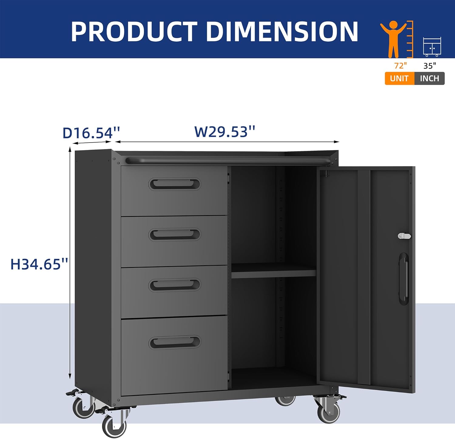 - Adjustable Shelf & Four Rotation Wheel: The shelf in this wall cabinet is adjustable and removable.You can adjust the height or remove the shelf according to your needs.The rugged steel construction can support shelves up to 130 pounds.The metal cabinet has four roting wheels, which is very convenient to move, and two fixed wheels can ensure that the cabinet is fixed when it needs to be fixed. The handle on the cabinet is convenient for you to push and pull, and you can take your cabinet to any place you want to go.