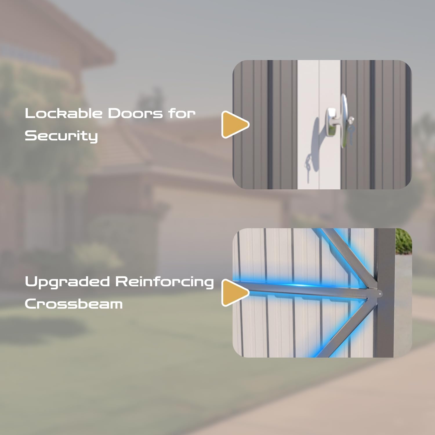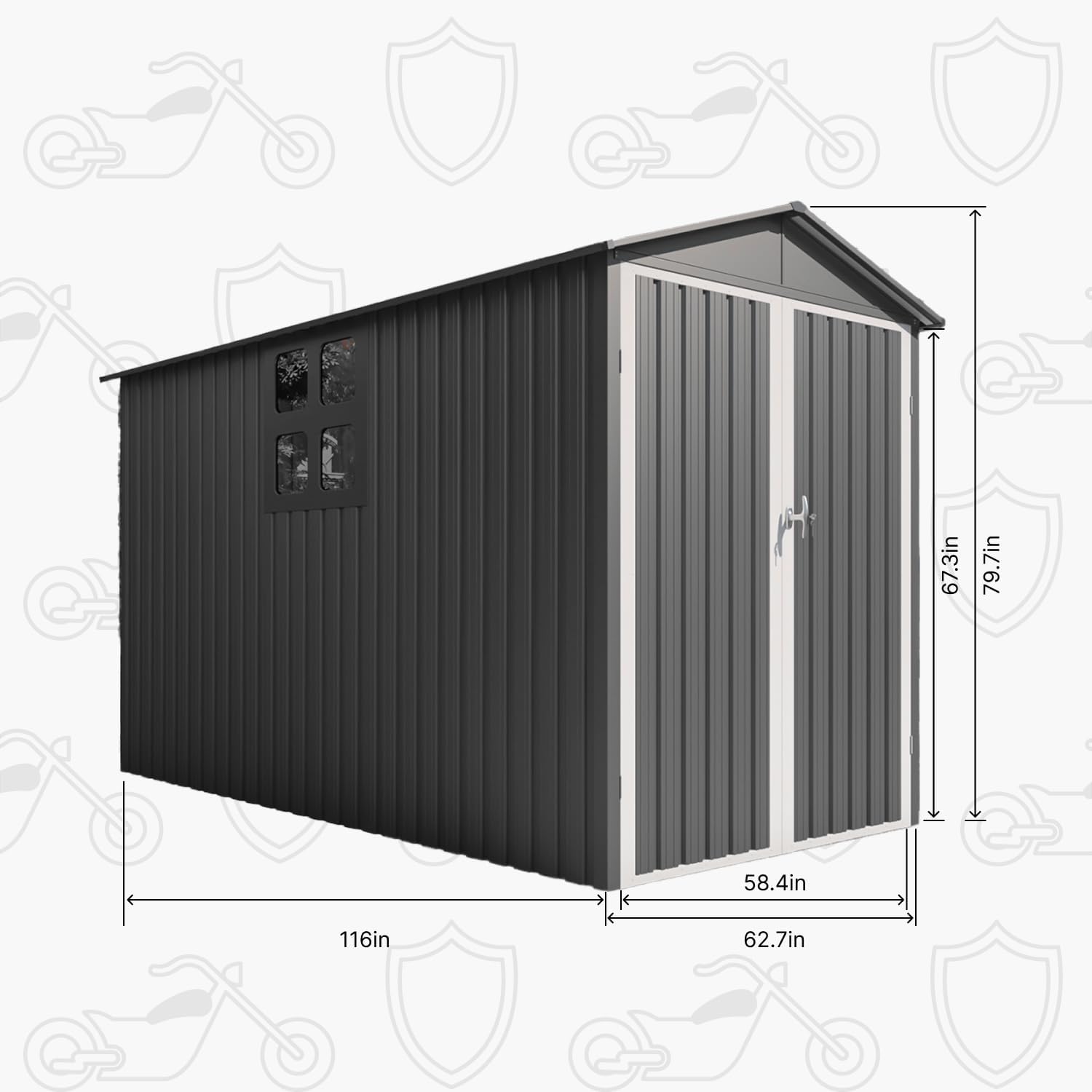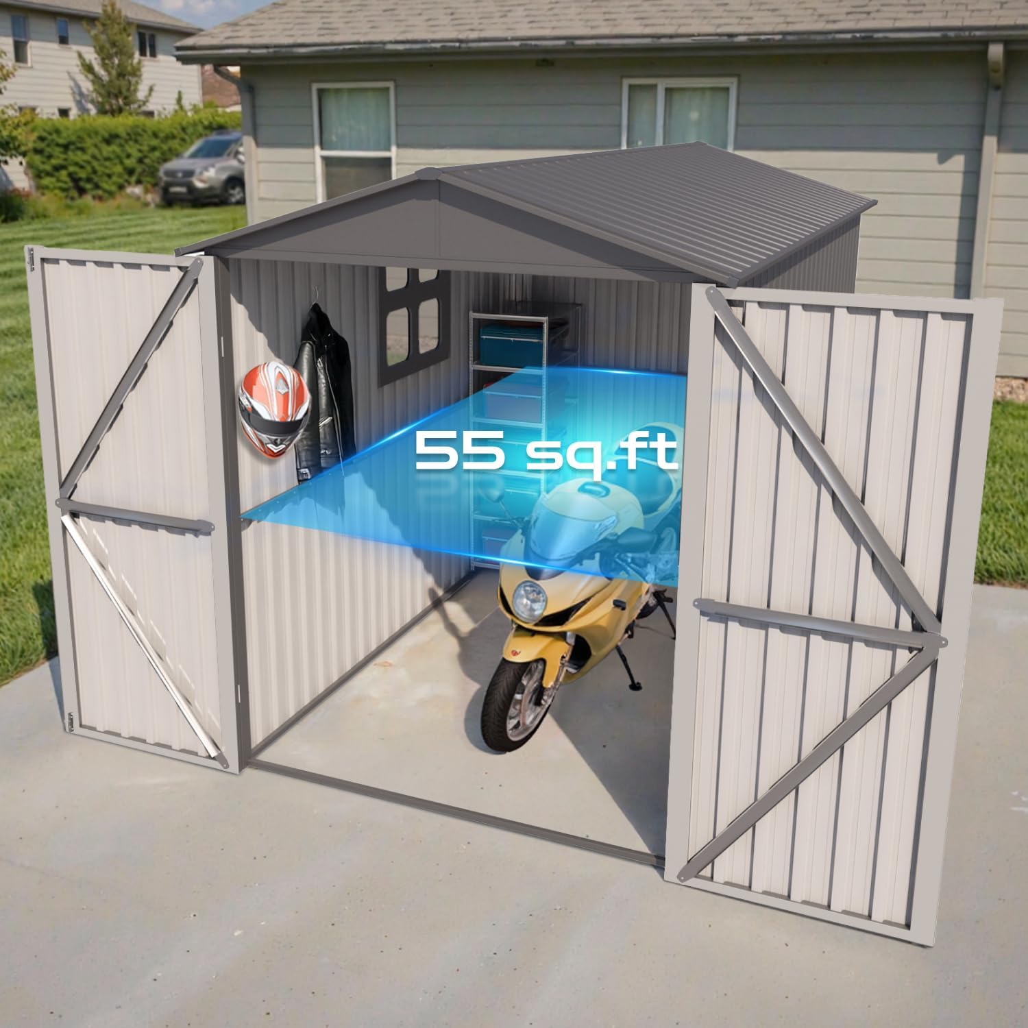 - [Fireproof & Anti-Theft] Steel motorcycle storage sheds deliver unmatched fire resistance and a tamper-proof lock system. This heavy duty vehicle shed safeguards bikes, tools, or heirlooms with dual-layer security—ensuring your valuables stay protected around the clock