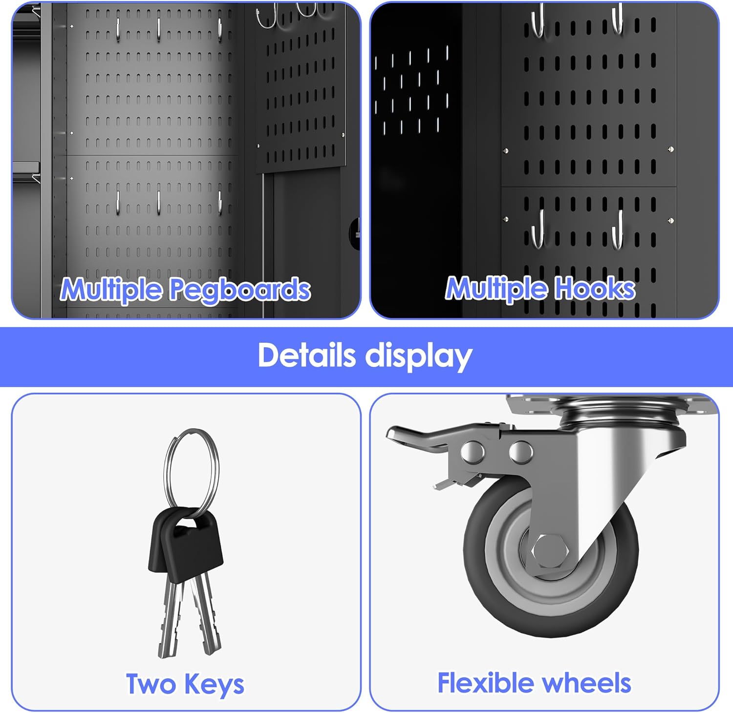 - Upgrade and Practical Design: This garage closet storage cabinet features the latest design and comes with a range of practical accessories to enhance storage space:5 pegboard, pegboard on side panels, 10 hooks; hanging rod and towel hangers with hanging hooks; 4 adjustable shelves; making it an ideal choice for storing tools, cleaning supplies, and everyday essentials;