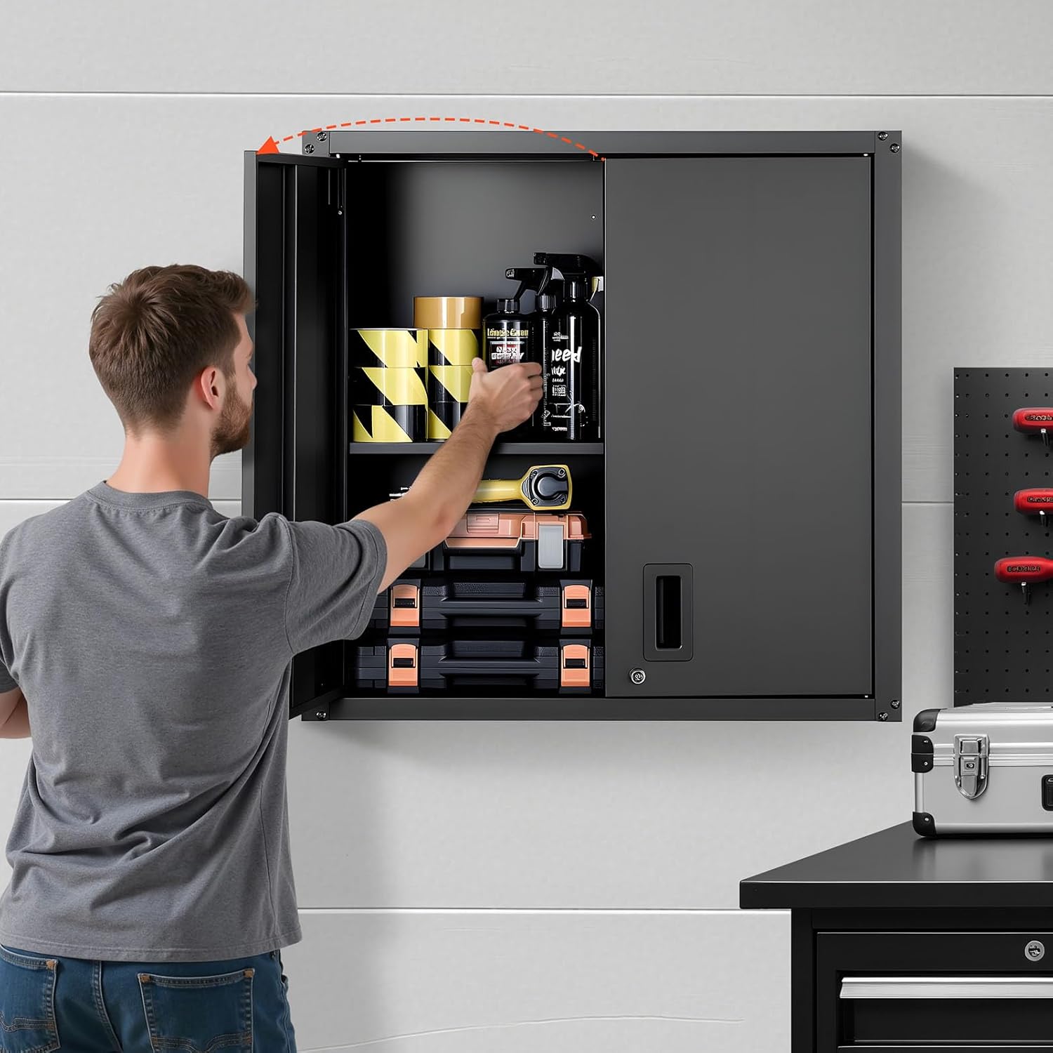 - Easy Access Doors: Dual side-opening doors open smoothly for quick access. A lock of the floating garage tool cabinet keeps items secure, while magnetic closures keep doors tightly shut for reliable use