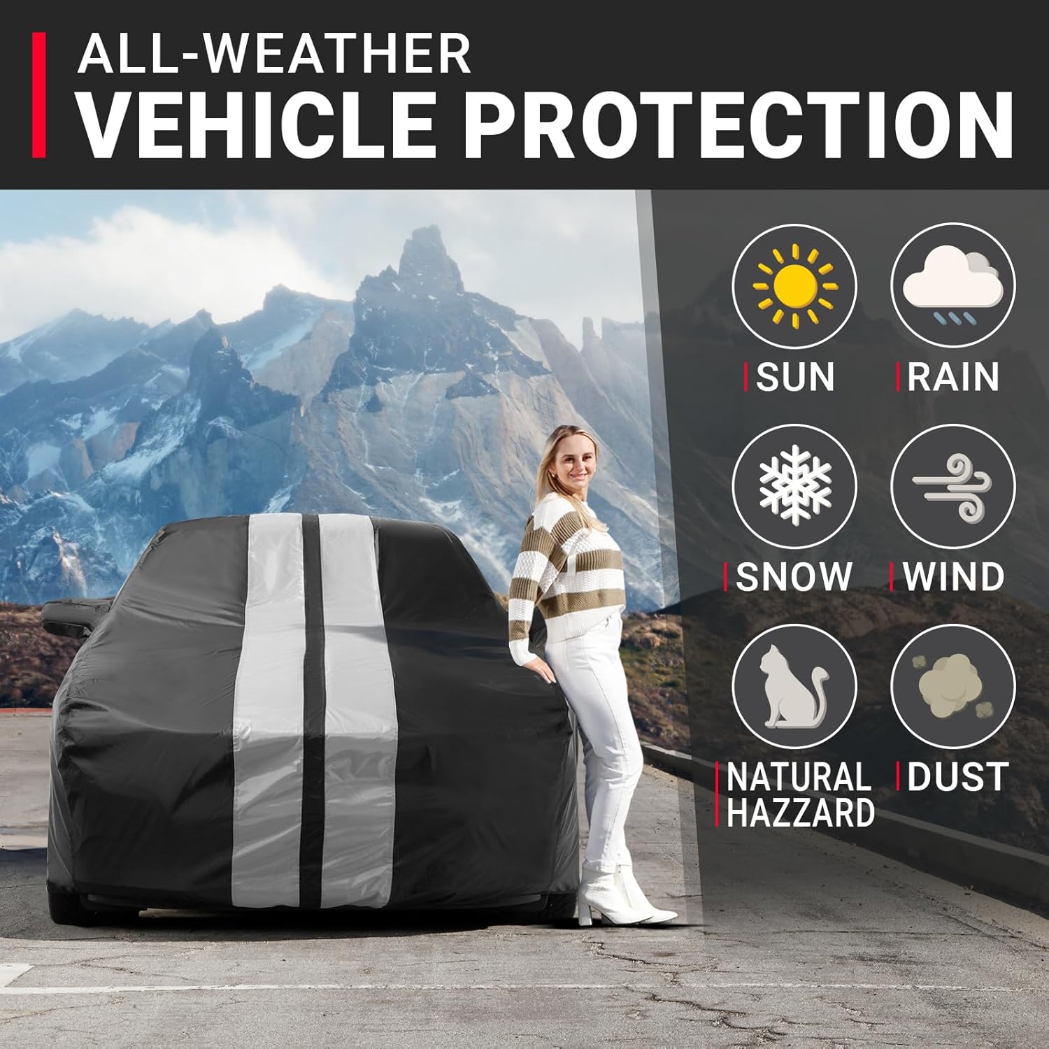- HEAVY DUTY & HIGH-QUALITY MATERIAL: Crafted from premium, durable materials, this car cover is built to last. It’s engineered to withstand even the toughest outdoor conditions, offering superior protection against scratches, dirt, UV rays, and other environmental hazards. Designed for long-term use, the high-quality construction resists wear and tear, ensuring your vehicle remains protected year after year.